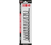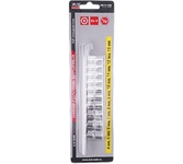 Набор укомплектован стальной рейкой с отдельными посадочными местами для каждой головки. Применяются в сфере ремонта и обслуживания автомобилей и других работ с резьбовым крепежом. Головка торцевая 6-гранная 1/4"DR: 4мм, 5мм, 6 мм, 7 мм, 8 мм, 9 мм, 10 мм, 11 мм, 12 мм, 13 мм Закалены до твердости 45-48HRC Материал - хромованадиевая сталь Покрытие: сатиновое