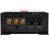 Усилитель 4-х канальный усилитель мощности. Класс АВ. Hi-level input (вход высокого уровня). Номинальная мощность 4? (RMS): 80 ватт. Номинальная мощность 2? (RMS): 120 ватт. Номинальная мощность, мостовое включение (3 и 4 каналы) 4? (RMS): 250 ватт. Диапазон воспроизводимых частот: 10Hz — 30KHz. Соотношение сигнал/шум: 90dB. Коэффициент нелинейных искажений: 0.15%. Сквозной выход RCA. Дистанционное управление громкостью (пульт не входит в комплект). Габариты: 320 х 190 х 54 mm.