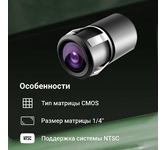 Максимальное разрешение записи 480 ТВ-линий. Сенсор (матрица) 1/3 PC7070. TV-система NTSC. Количество пикселей 648 x 488. Минимальная освещенность 0.01 люкс. Угол обзора 170°. Динамичный диапазон >64 дБ; SNR: >47.2 дБ. Рабочая температура от –10°С до +46°С. Рабочее напряжение 12V +/- 10%. Класс пылевлагозащиты IP67. Потребляемая мощность, макс 0.5W. Электронная шторка 1/60. Парковочные линии. Изображение с камеры зеркальное.