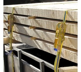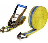 Выдерживают нагрузку на прямое стяжное усилие – 5 тонн и стяжное усилие при обхвате – 10 тонн. Характеристики • Храповый стяжной механизм длиной 230мм из высококачественной стали с анатомической ручкой облитой пластиком. • Высокопрочная лента из полипропилена 55 мм. Имеет прочные швы. Отличается морозостойкостью и устойчивостью к агрессивным средам. Длина ленты составляет 12 метров. • J – образные стальные крюки.