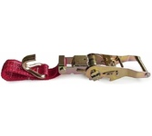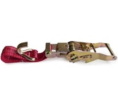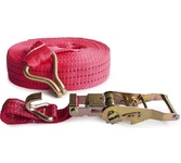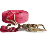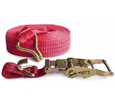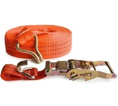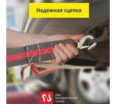 Выдерживает нагрузку на прямое стяжное усилие – 2 тонну и стяжное усилие при обхвате – 4 тонны. Характеристики • Храповый стяжной механизм из стали с ручкой типа «Эконом» (ручка полностью стальная, не имеет вставок). • Высокопрочная лента из полипропилена 50 мм. Имеет прочные швы. Отличается морозостойкостью и устойчивостью к агрессивным средам. Длина ленты составляет 8 метров. • J – образные стальные крюки.