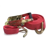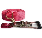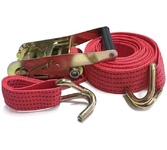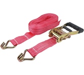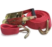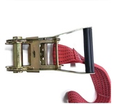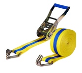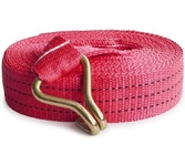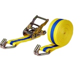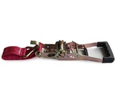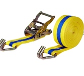 Выдерживают нагрузку на прямое стяжное усилие – 2,5 тонн и стяжное усилие при обхвате – 5 тонн. Характеристики • Храповый стяжной механизм длиной 230мм из высококачественной стали с анатомической ручкой облитой пластиком. • Высокопрочная лента из полипропилена 50 мм. Имеет прочные швы. Отличается морозостойкостью и устойчивостью к агрессивным средам. Длина ленты составляет 6 метров. • J – образные стальные крюки.
