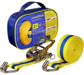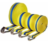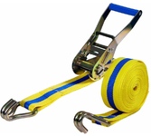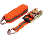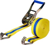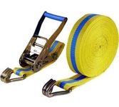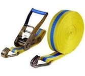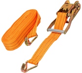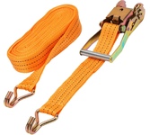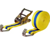 Выдерживают нагрузку на прямое стяжное усилие – 2,5 тонн и стяжное усилие при обхвате – 5 тонн. Характеристики • Храповый стяжной механизм длиной 230мм из высококачественной стали с анатомической ручкой облитой пластиком. • Высокопрочная лента из полипропилена 50 мм. Имеет прочные швы. Отличается морозостойкостью и устойчивостью к агрессивным средам. Длина ленты составляет 6 метров. • J – образные стальные крюки.