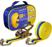 Выдерживают нагрузку на прямое стяжное усилие – 2,5 тонн и стяжное усилие при обхвате – 5 тонн. Характеристики • Храповый стяжной механизм длиной 230мм из высококачественной стали с анатомической ручкой облитой пластиком. • Высокопрочная лента из полипропилена 50 мм. Имеет прочные швы. Отличается морозостойкостью и устойчивостью к агрессивным средам. Длина ленты составляет 10 метров. • J – образные стальные крюки.