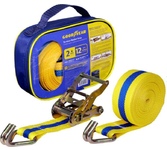 Багажный ремень с крюками Stels 54388 шириной 5 см и длиной 12 м, с храповым механизмом, предназначен для фиксации грузов на решетчатых конструкциях, например, открытых автомобильных багажниках, а также в прицепах. Пригодится для транспортировки различных предметов. Преимущества Износостойкость — ремень изготовлен из прочного и морозостойкого полипропилена, крюки из углеродистой стали устойчивы к деформации. Надежная фиксация груза во время движения и маневров автомобиля — допустимая разрывная нагрузка составляет 800 кг, стальные крюки крепко удерживают натянутый ремень. Комфортное и быстрое затягивание ленты — ремень снабжен храповым механизмом. Удобное хранение — ремень весит 1,774 кг и в сложенном виде очень компактен.