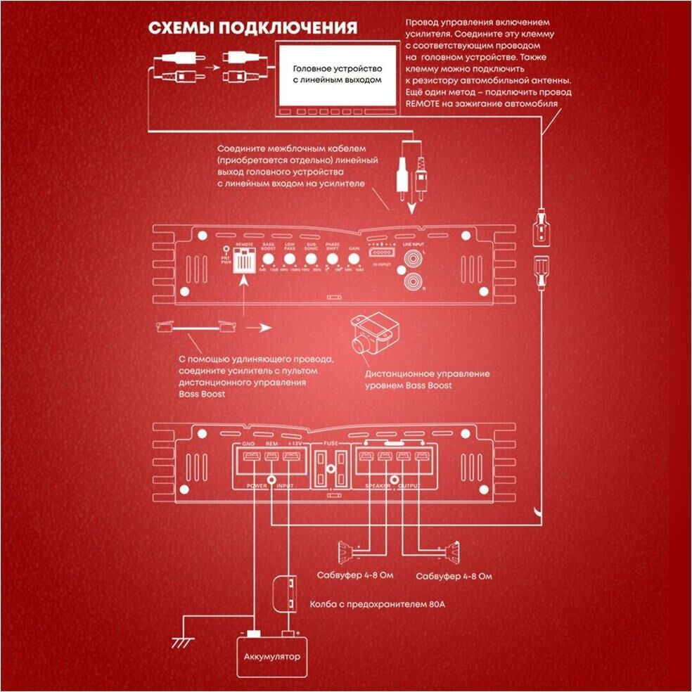 Стабильная работа на нагрузках: 1 Ом Bass Boost: Bass Boost плавный 0-18дБ Номинал предохранителя: 2 х 30А Диапазон частот: 10Гц ~ 300Гц Воспроизведение звука Пиковая мощность: 1000Вт Номинальная мощность 4 Ом: 300Вт х 1 Номинальная мощность 2 Ом: 500Вт х 1 Номинальная мощность 1 Ом: 650Вт х 1 Чувствительность: 200мВ-8В Отношение сигнал/шум: >96дБ Коэффициент гармонических искажений: (THD) @ 1кГц (40м): 0,15% Разделение каналов Разделение каналов: >45 дБ Low pass фильтр: 10-250 Гц Число каналов: 1 Общие характеристики Размеры: 180 x 48 x 220 мм