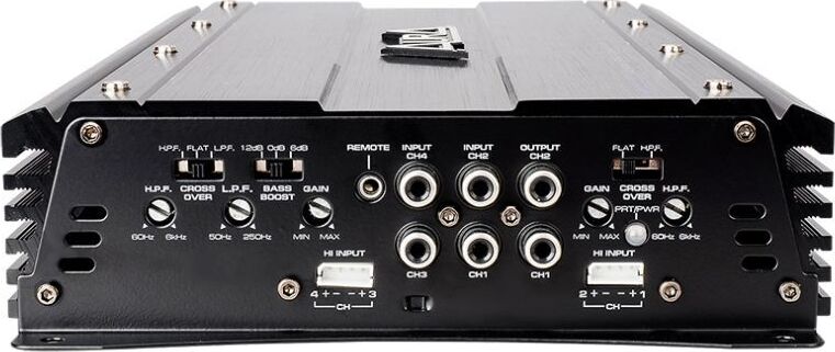 Усилитель 4-х канальный усилитель мощности. Класс АВ. Hi-level input (вход высокого уровня). Номинальная мощность 4? (RMS): 80 ватт. Номинальная мощность 2? (RMS): 120 ватт. Номинальная мощность, мостовое включение (3 и 4 каналы) 4? (RMS): 250 ватт. Диапазон воспроизводимых частот: 10Hz — 30KHz. Соотношение сигнал/шум: 90dB. Коэффициент нелинейных искажений: 0.15%. Сквозной выход RCA. Дистанционное управление громкостью (пульт не входит в комплект). Габариты: 320 х 190 х 54 mm.