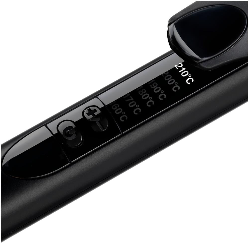 Щипцы для завивки волос. Нагрев до 210°C. Диаметр щипцов 19 мм. Покрытие кварц-керамика. Быстрый нагрев. 6 температурных режимов 160-170-180-190-200-210°C. LED дисплей с белой подсветкой. Длинная рабочая поверхность 130 мм. Вращающийся шнур 2.5м. Термоустойчивый коврик