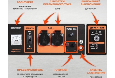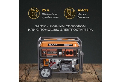 Модель двигателя LT188F. Тип двигателя Одноцилиндровый, четырехтактный, с воздушным охлаждением, верхнеклапанный. Объем двигателя, (куб. см.) 389. Максимальная мощность л.с 13. Система зажигания Электрозапуск. Объем топливного бака, л 25. Время непрерывной работы (ч) 10. Мин. расход топлива, г/кВт*ч 360. Уровень шума, дБ 74. Объем масляного картера, л 1.1. Генератор Частота переменного тока, Гц 50. Напряжение переменного тока, В 220. Номинальная мощность , кВт 5. Максимальная мощность, кВт 5.5. Генераторная установка Длина, мм 800. Ширина, мм 530. Высота, мм 507. Вес нетто/брутто, кг 82/85.
