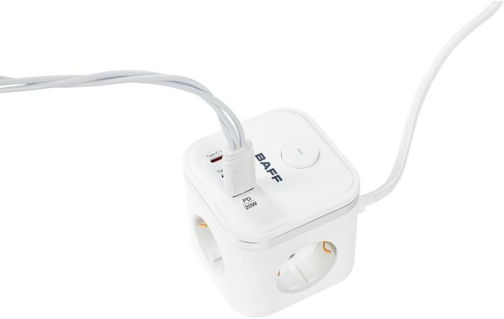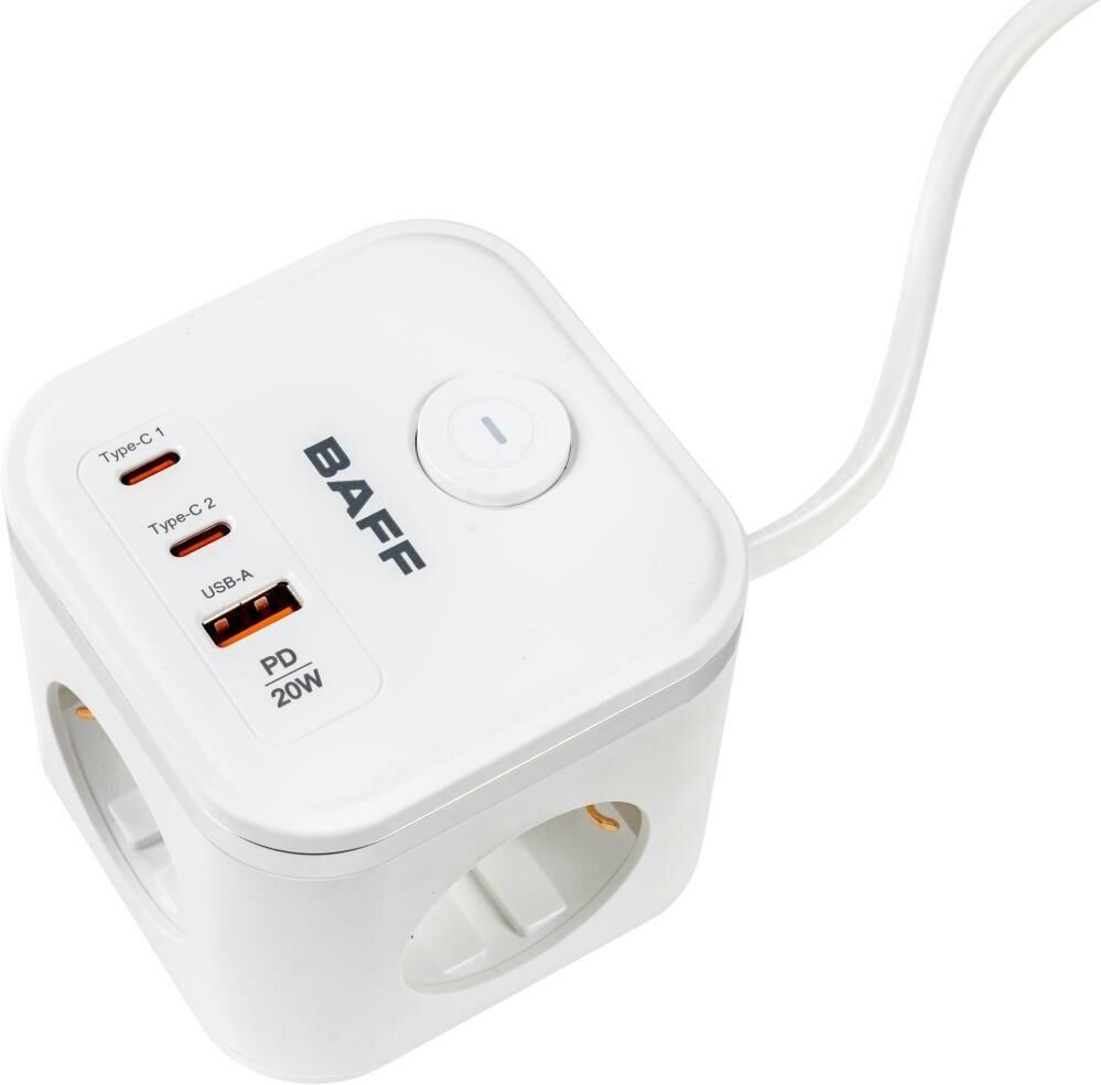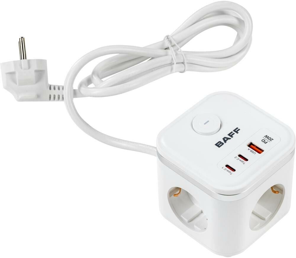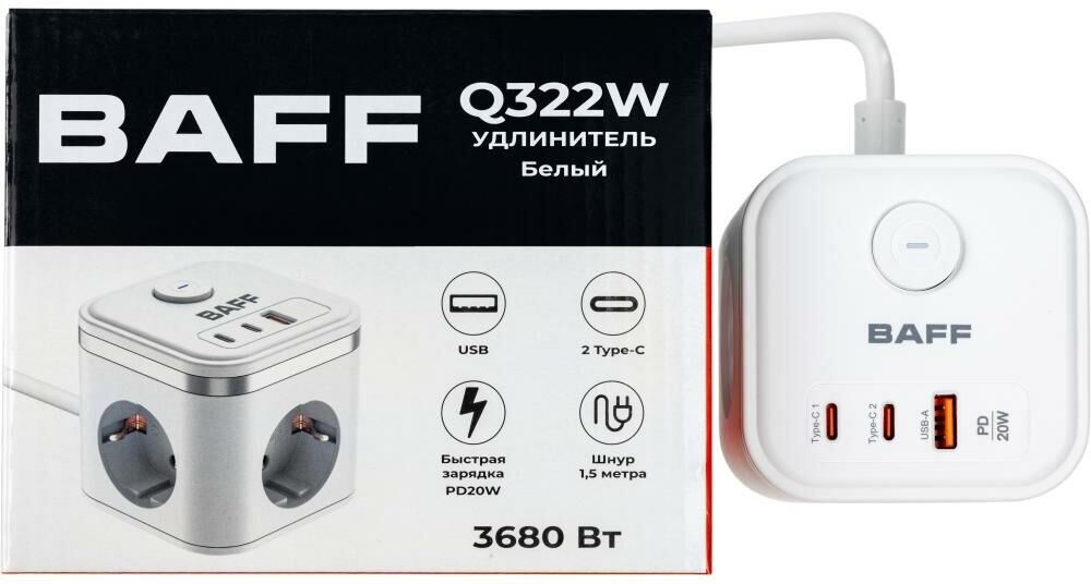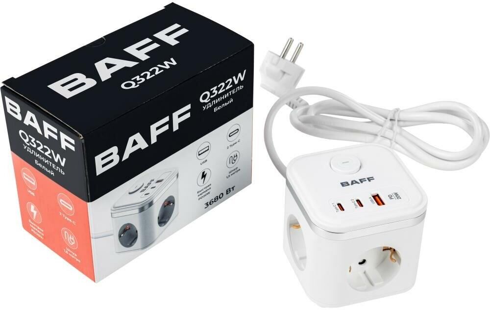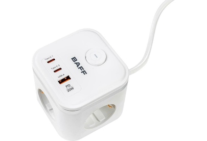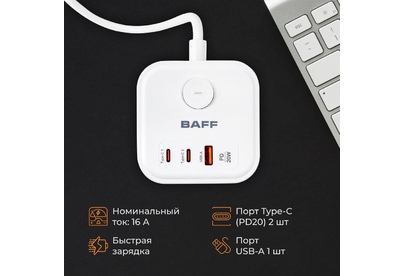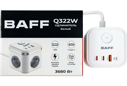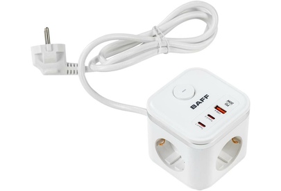 Удлинитель BAFF Q322 представляет собой устройство, предназначенное для подключения ваших устройств в местах, удалённых от стационарных розеток. Удлинитель с возможностью одновременного подключения сразу нескольких приборов оснащен тремя евророзетками переменного тока. Длина сетевого шнура составляет 1,5 метра. Сетевой фильтр имеет 2 порта Type-C (PD20) и выход USB-A, что позволяет быстро заряжать смартфон, планшет или любое другое портативное устройство.