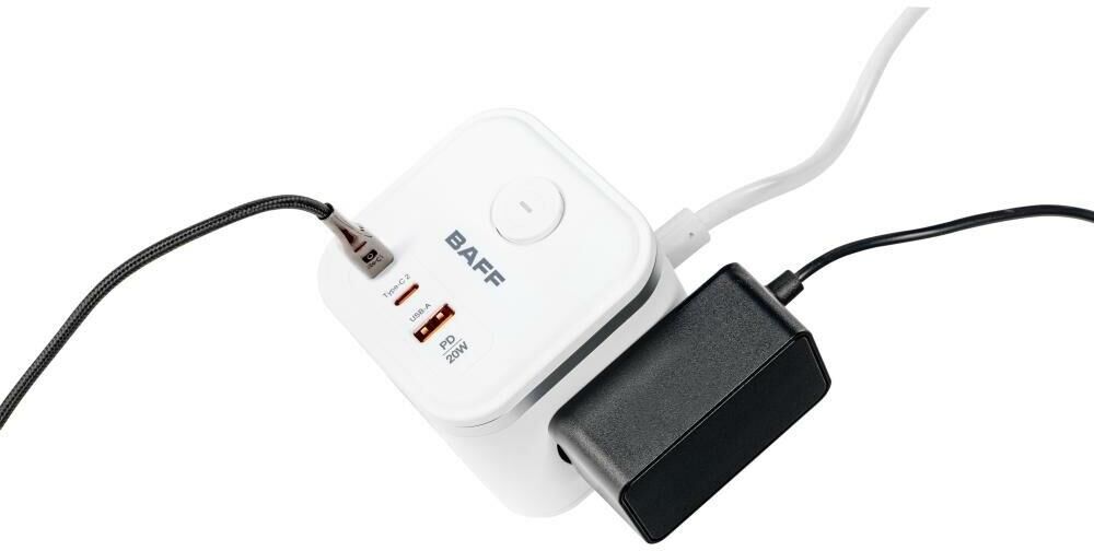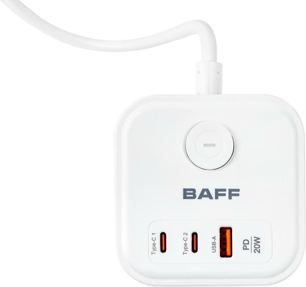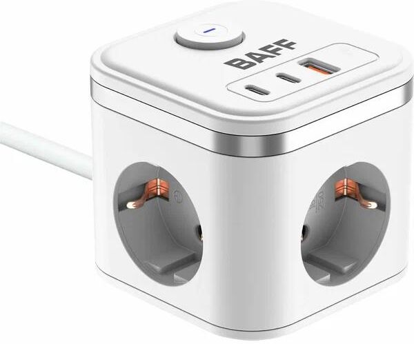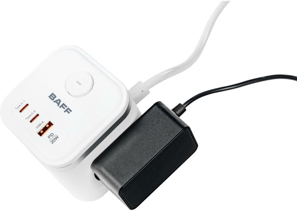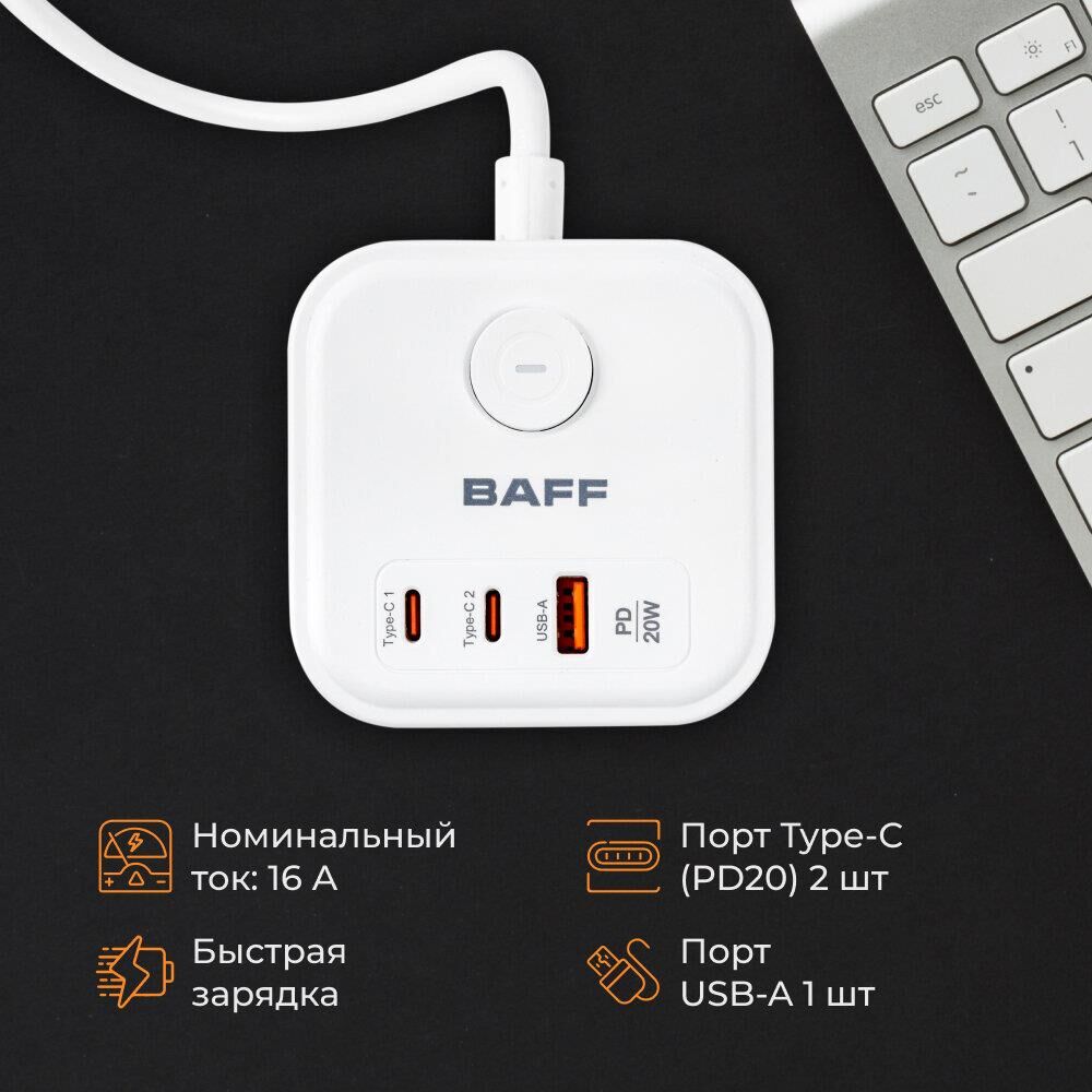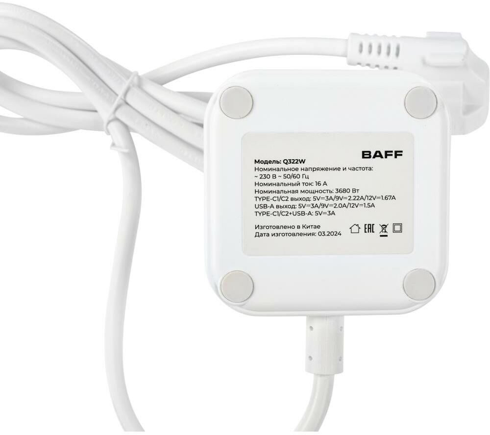 Удлинитель BAFF Q322 представляет собой устройство, предназначенное для подключения ваших устройств в местах, удалённых от стационарных розеток. Удлинитель с возможностью одновременного подключения сразу нескольких приборов оснащен тремя евророзетками переменного тока. Длина сетевого шнура составляет 1,5 метра. Сетевой фильтр имеет 2 порта Type-C (PD20) и выход USB-A, что позволяет быстро заряжать смартфон, планшет или любое другое портативное устройство.
