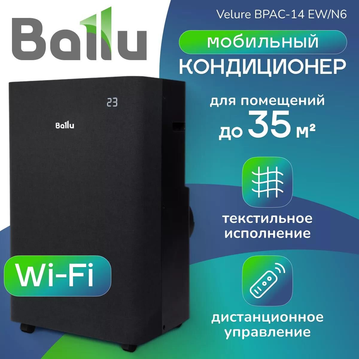 BALLU Velure – сочетание изысканного дизайна и самых современных технологий. Оригинальное исполнение с тканевой фронтальной панелью делает прибор настоящим украшением современного интерьера Серия Velure эффективна для охлаждения помещений площадью от 30 м до 35 м. Прибор имеет широкий набор функций, призванных обеспечить максимально комфортную эксплуатацию. Управление через Wi-Fi позволяет управлять прибором где бы вы не находились и создавать сложные расписания работы. Автоматические жалюзи обеспечивают равномерное распределение прохлады по комнате и предотвращают возникновение сквозняков. Управляйте прибором по Wi-Fi из любой точки мира Скрытый LED дисплей.