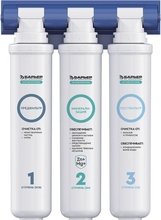 Фильтр нового поколения Барьер Актив Сила красоты разработан на базе уникальных австрийских технологий обогащения воды полезными минералами. Трехступенчатый и в тоже время компактный фильтр, эффективно очищает воду от хлора, органических примесей и тяжелых металлов, дозируя в воду Магний и Цинк, недостатком которого страдает 90% населения России. Для тех, кому важен внешний вид и внутреннее здоровье организма. Здоровье и молодость. Цинк играет важную роль в различных физиологических и метаболических процессах. Он придает аппетит нашей жизни, позволяя организму наслаждаться запахами и вкусами. Повышает уровень тестостерона Улучшает состояние кожи, волос, ногтей Регулирует обмен веществ Снижает риск развития аллергии