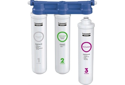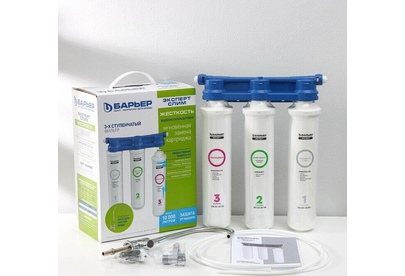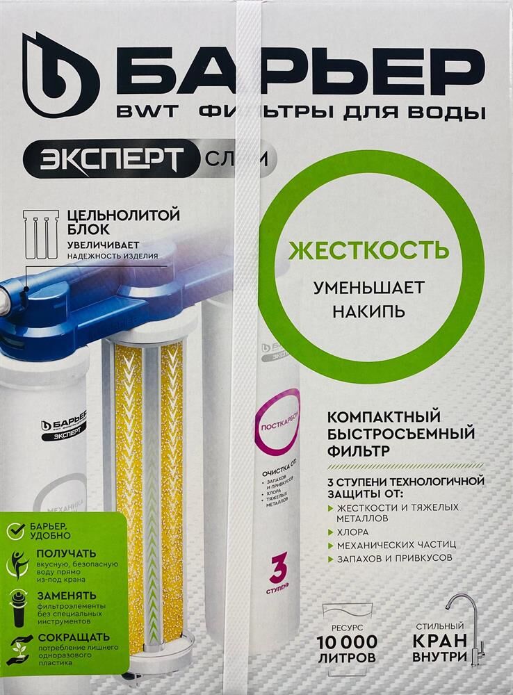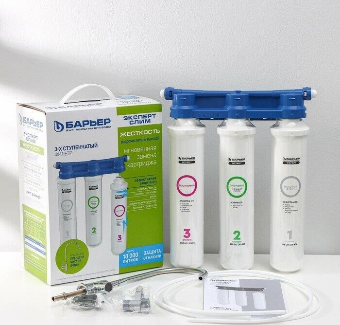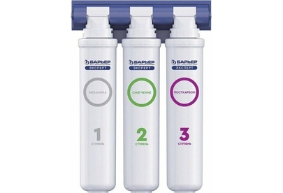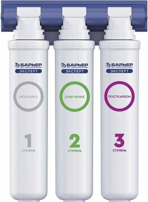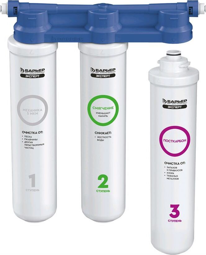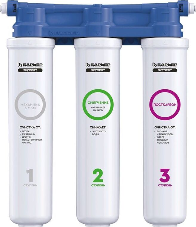в комплекте картридж ЭКСПЕРТ Механика, картридж ЭКСПЕРТ Смягчение, картридж ЭКСПЕРТ ПостКарбон, технология SmartLock предотвращает извлечение фильтроэлемента под давлением
