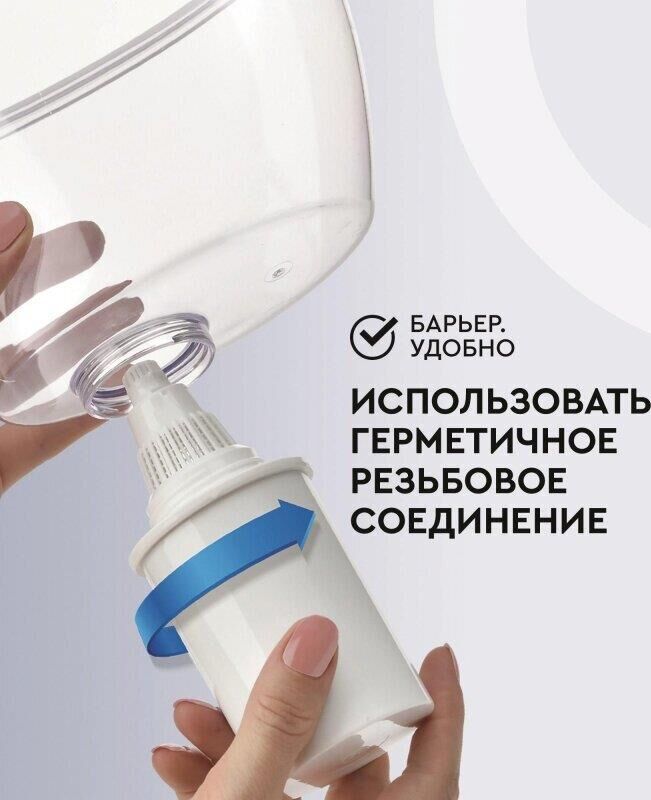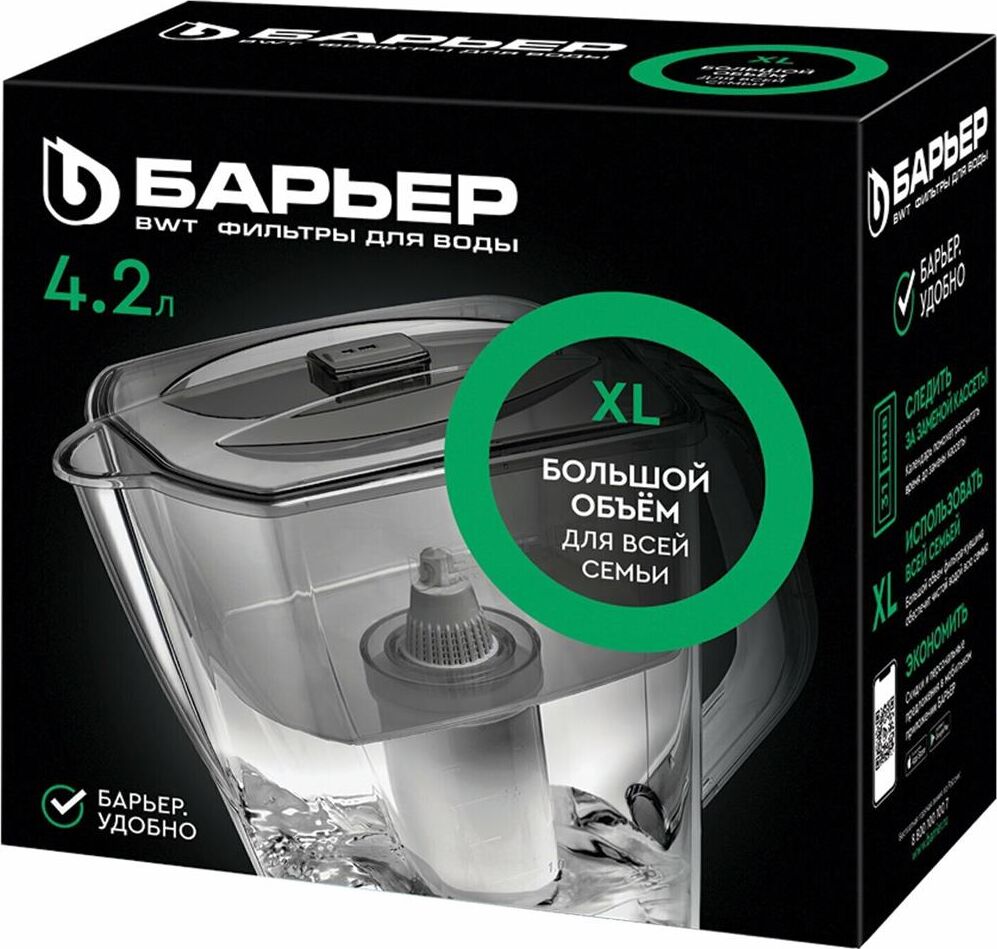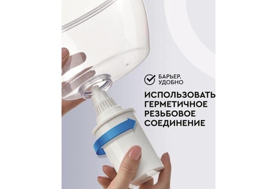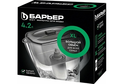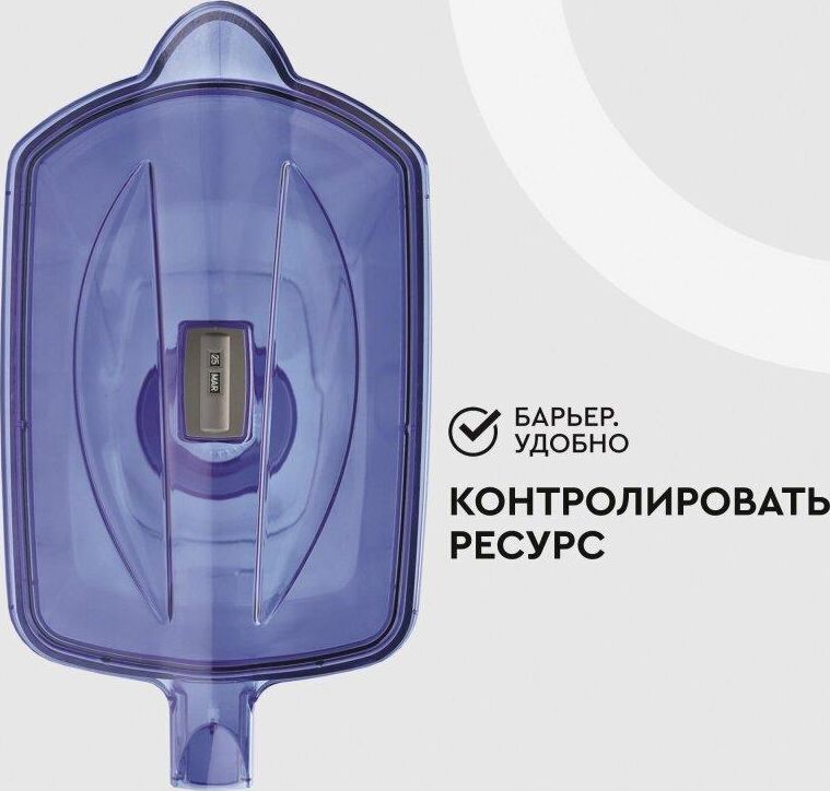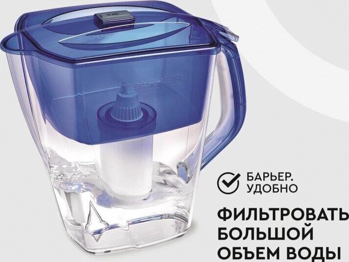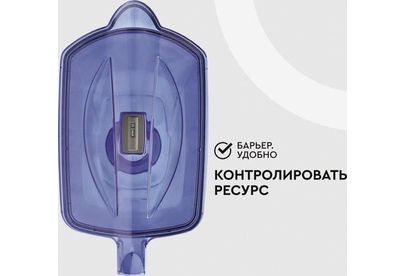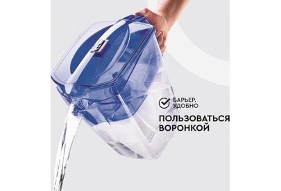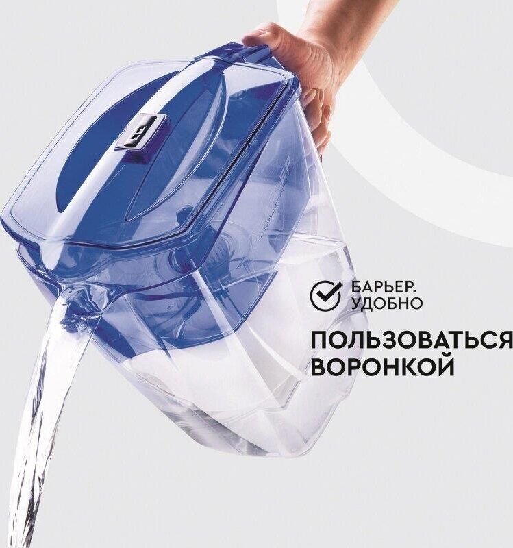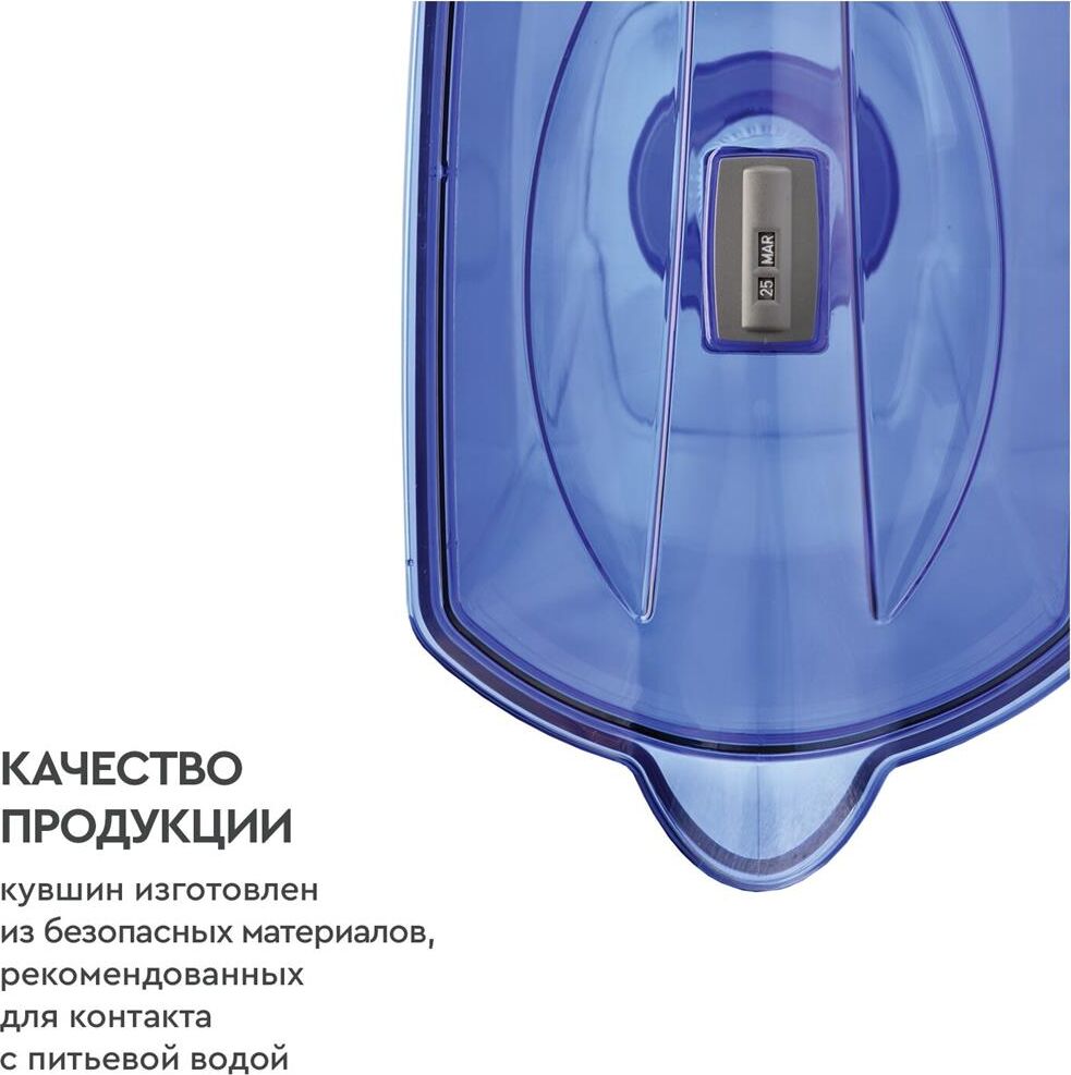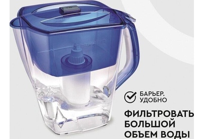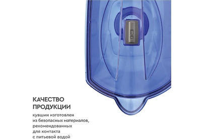 Большой кувшин для всей семьи. Характеристики: объем кувшина 4,2 литра, объем воронки 1,7 литра, автоматически открывающаяся воронка, мерная шкала на корпусе, механический индикатор замены кассеты, срок службы не более 5 лет. Цвет: ультрамарин. Кассета "Стандарт" в комплекте (ресурс кассеты 350 л)