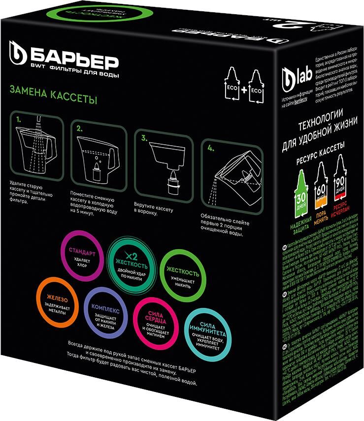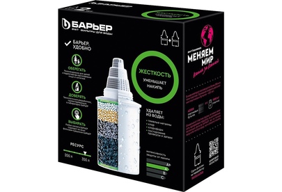 Количество в упаковке 2 Ресурс, л 350 Проблема воды Жесткая вода Тип очищаемой воды Питьевая водопроводная Срок хранения, мес 36 Размеры упаковки, ДхШхВ 129x64x146мм Срок хранения, мес 36 Вес, кг 0.3 Очищает воду от солей жесткости, которые мы привыкли встречать в жизни в виде накипи в чайнике, кофе-машине и налете на кухонном кране. Кассета БАРЬЕР Жесткость снижает образование накипи, а также удаляет основные вредные примеси, оставляя только свежую чистую воду. Ресурс каждой кассеты — 350 литров. С фильтрами БАРЬЕР вам не придется запоминать размер или диаметр сменной кассеты: любая кассета БАРЬЕР подходит ко всем фильтрам-кувшинам БАРЬЕР. А герметичное резьбовое соединение исключает попадание неочищенной воды в отфильтрованную. Ресурс зависит от качества исходной воды, но составляет не более 350 литров для каждой кассеты.