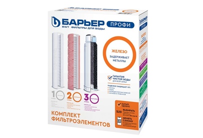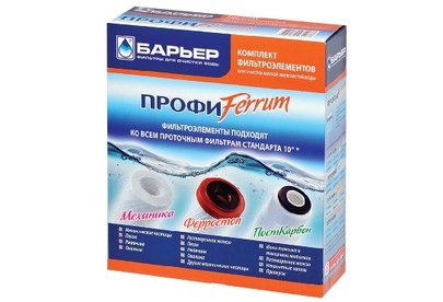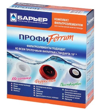 Комплект фильтроэлементов для ПРОФИ Ferrum: - БАРЬЕР ПРОФИ Механика для очистки от нерастворимых в воде частиц: ржавчины, – окалины – песка и др.; - Барьер ПРОФИ Ферростоп для очистки от железа при высоких концентрациях (до 3 ПДК); - БАРЬЕР ПРОФИ Посткарбон для очистки от железа – ионов тяжелых и токсичных металлов – устранения неприятных привкусов и запаха.