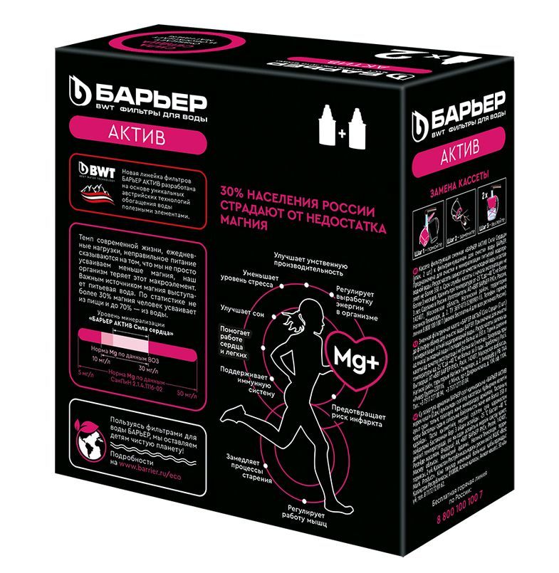 С активированным углем С магнием Механическая фильтрация Очистка от свободного хлора Эффект Очистка и минерализация воды Число степеней очистки 3 Ресурс кассеты фильтра, л 350 1 фильтр БАРЬЕР заменяет 350 пластиковых бутылок в месяц и около 170 кг выброшенного пластика в год.