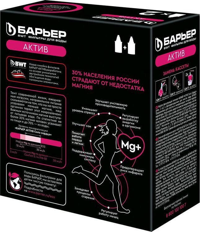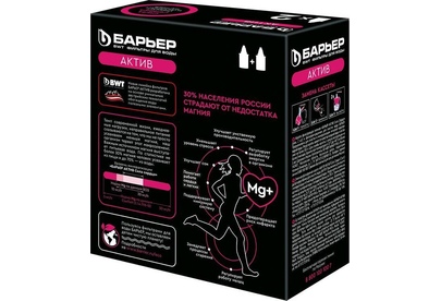 С активированным углем С магнием Механическая фильтрация Очистка от свободного хлора Эффект Очистка и минерализация воды Число степеней очистки 3 Ресурс кассеты фильтра, л 350 1 фильтр БАРЬЕР заменяет 350 пластиковых бутылок в месяц и около 170 кг выброшенного пластика в год.