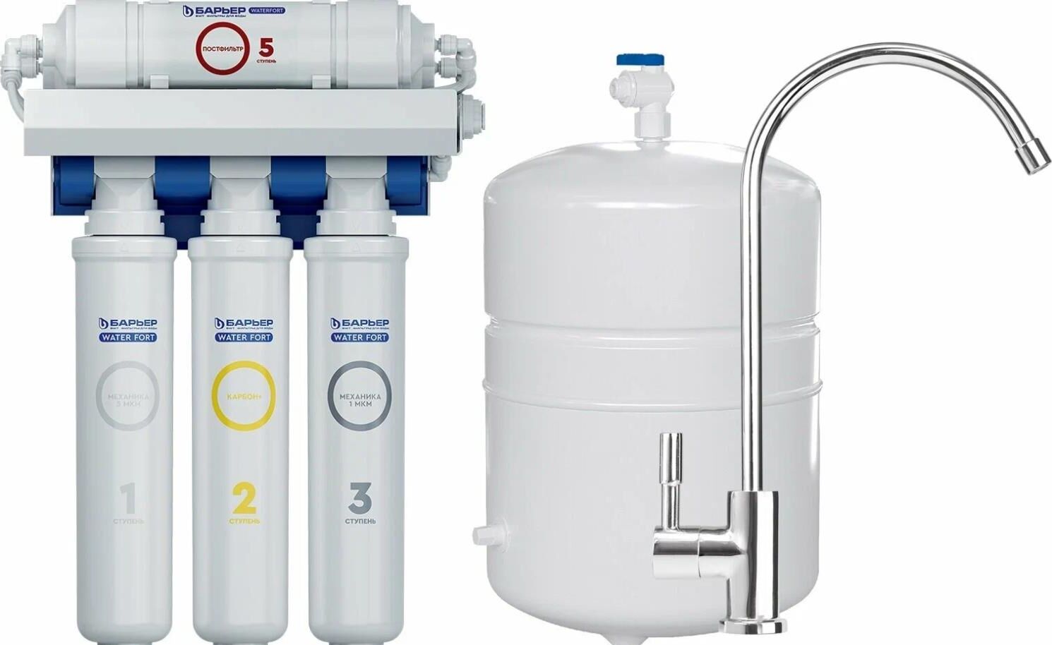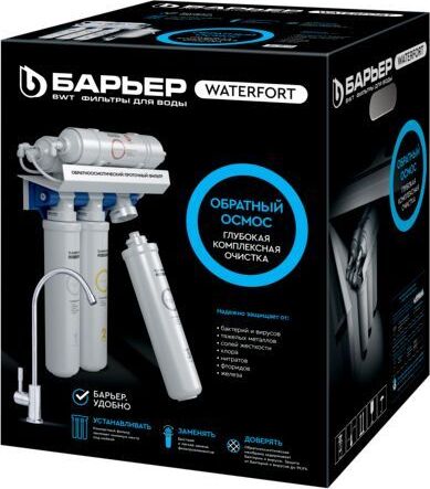 5-ти ступенчатый обратноосмотический фильтр нового поколения предназначен для глубокой очистки питьевой воды из централизованных источников водоснабжения от большинства содержащихся в ней вредных веществ. Всё необходимое для установки в комплекте. Подключение фильтра осуществляется через быстросъемные соединения Quick fitting 1/4”. В комплекте: WaterFort Osmo Механика 1 мкм , WaterFort Osmo мембрана, WaterFort Osmo ПостФильтр, WaterFort Osmo Механика 5 мкм , WaterFort Osmo Карбон+