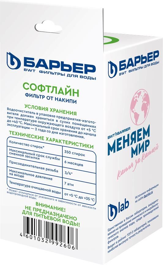 Компактный помощник для защиты бытовой техники. Защищает водонагревательные элементы от накипи, продлевает срок службы оборудования. При стирке в умягченной воде ваши вещи дольше сохраняют яркость цвета и мягкость. Фильтр устанавливается непосредственно перед тем устройством, для которого требуется умягчение воды. Воду после фильтра БАРЬЕР Софт Лайн можно использовать ТОЛЬКО в технических целях. Не использовать в качестве питьевой воды! Ресурс, л 15000 Минимальное давление, атм 1.5 Максимальное давление, атм 7 Тип очищаемой воды Для бытовых нужд Диаметр подключения 3/4 Проблема воды Жесткая вода Вес, кг 0.3