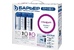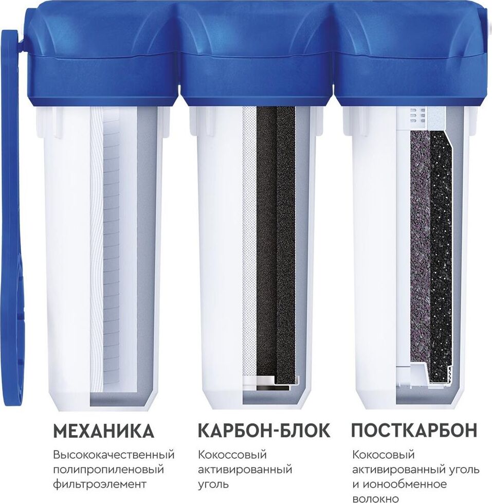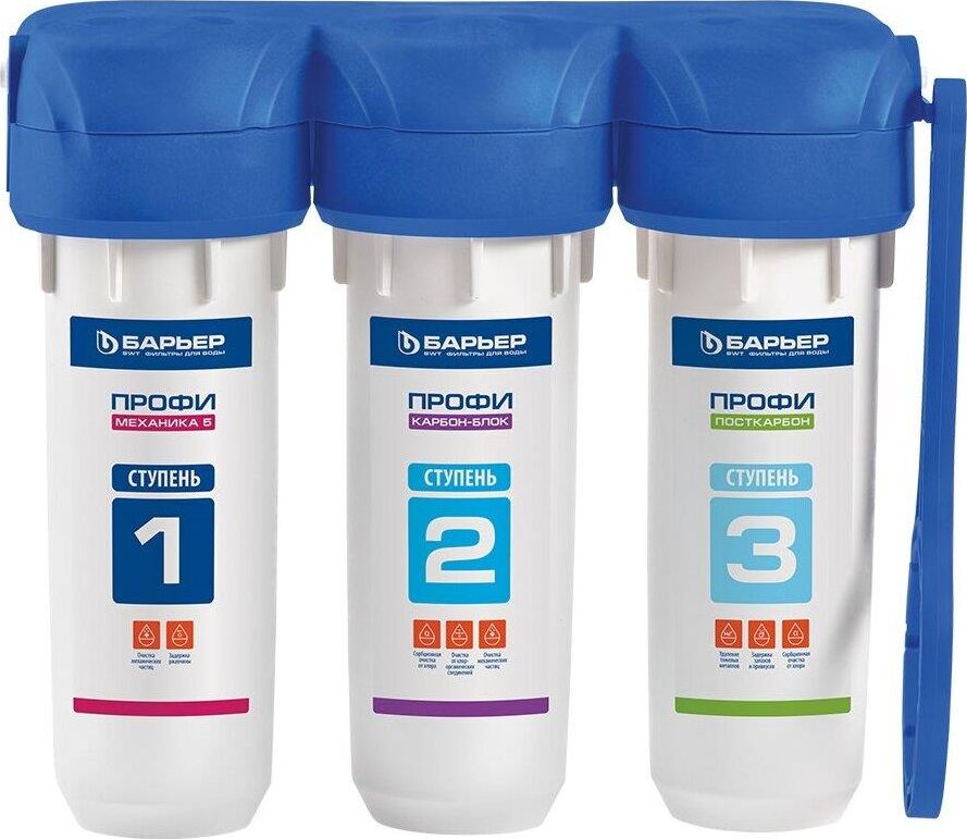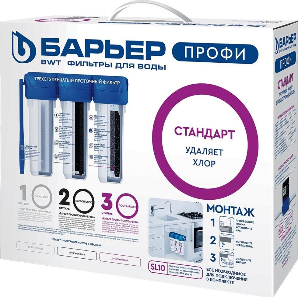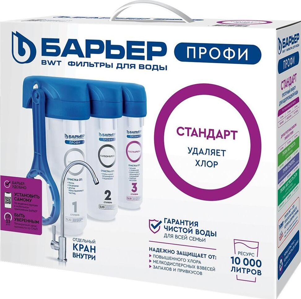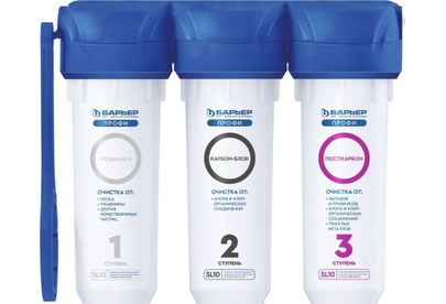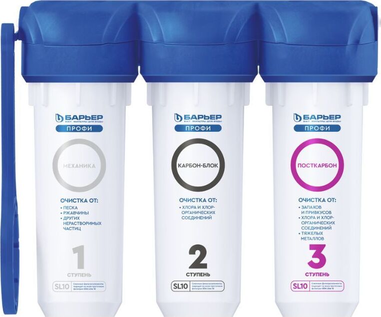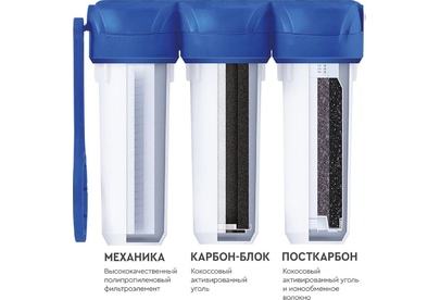 Базовая, трёхступенчатая очистка водопроводной воды от активного хлора,органических и хлорорганических соединений,тяжёлых металлов и др. вредных веществ.мах.давление 7 атм, расход 2л/мин, ресурс - 10.000 л.