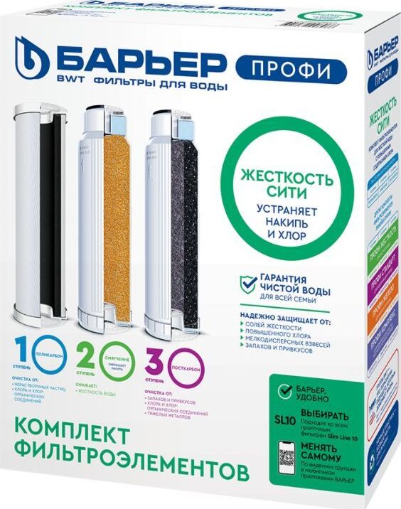 Набор из трех картриджей для фильтров «Профи Жесткость Сити» для жёсткой и сильно хлорированной воды с увеличенным ресурсом по удалению хлора. Позволяет забыть о накипи. Обеспечивает более глубокую очистку от хлора и побочных продуктов хлорирования за счёт нового картриджа Поликарбон. Вторая ступень «Смягчение» может быть подвергнута многократной регенерации раствором поваренной НЕ йодированной соли в домашних условиях. Производительность - 2 л/мин. Протестирован на максимальное давление 30 АТМ - 4-х кратный запас прочности. Ресурс 10000 литров. Подходит для ПРОФИ Жесткость Сити (исп. Лайт)