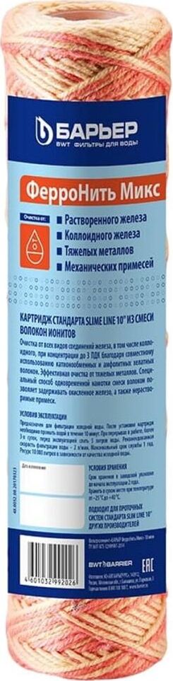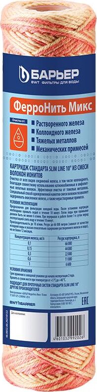 Картридж для очистки воды от растворенного и коллоидного железа, механических примесей и тяжелых металлов. Может использоваться в системе централизованного холодного водоснабжения, а также для скважин и колодцев с высоким содержанием окисленного железа. Подходит для ВМ 3/4", ВМ 1/2"