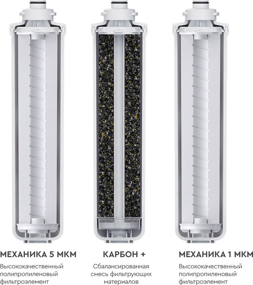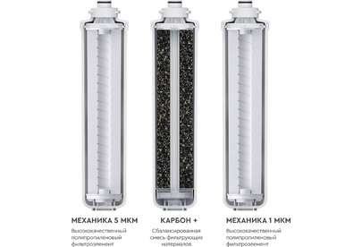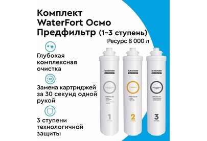 Комплект из трех сменных картриджей для фильтров серии WaterFort Osmo. В набор входят фильтроэлементы 1–3-й ступеней очистки. Защищает мембрану от механических взвесей, а также соединений хлора. Подходит для: Фильтр WaterFort OSMO