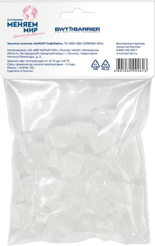 Сменная засыпка для бытового фильтра БАРЬЕР Софт Лайн. Защищает водонагревательные элементы от накипи, продлевает срок службы оборудования. Воду после фильтра БАРЬЕР Софт Лайн можно использовать ТОЛЬКО в технических целях. Не использовать в качестве питьевой воды! Масса -132 г (±10%) Размеры упаковки, ДхШхВ 90x30x160мм