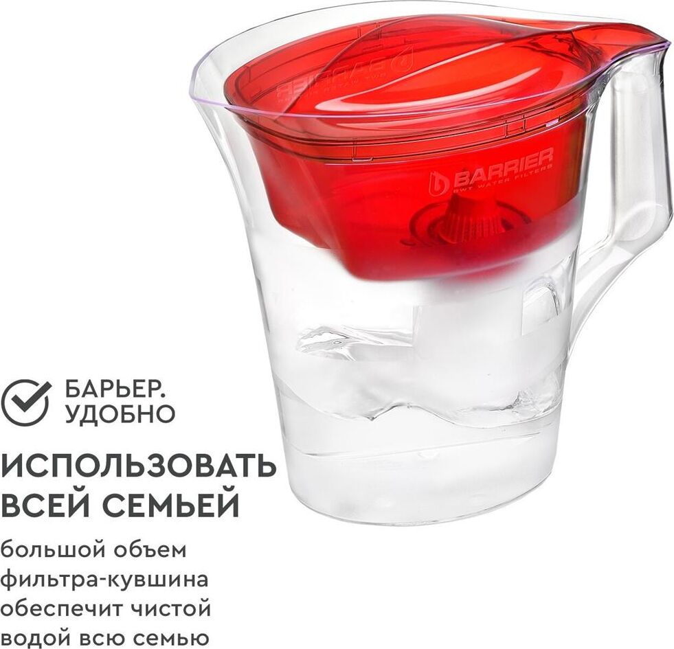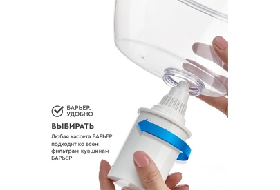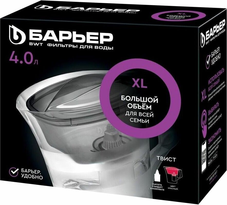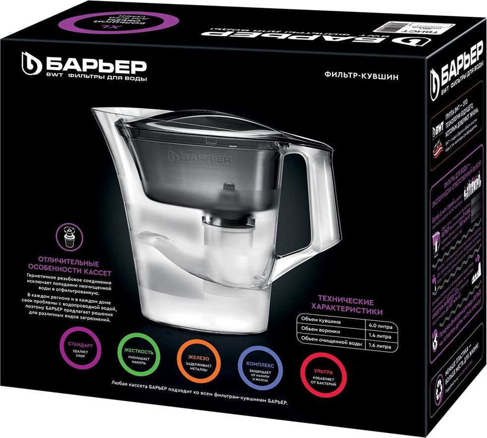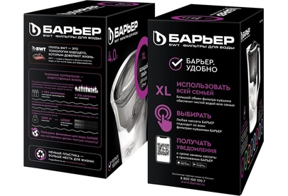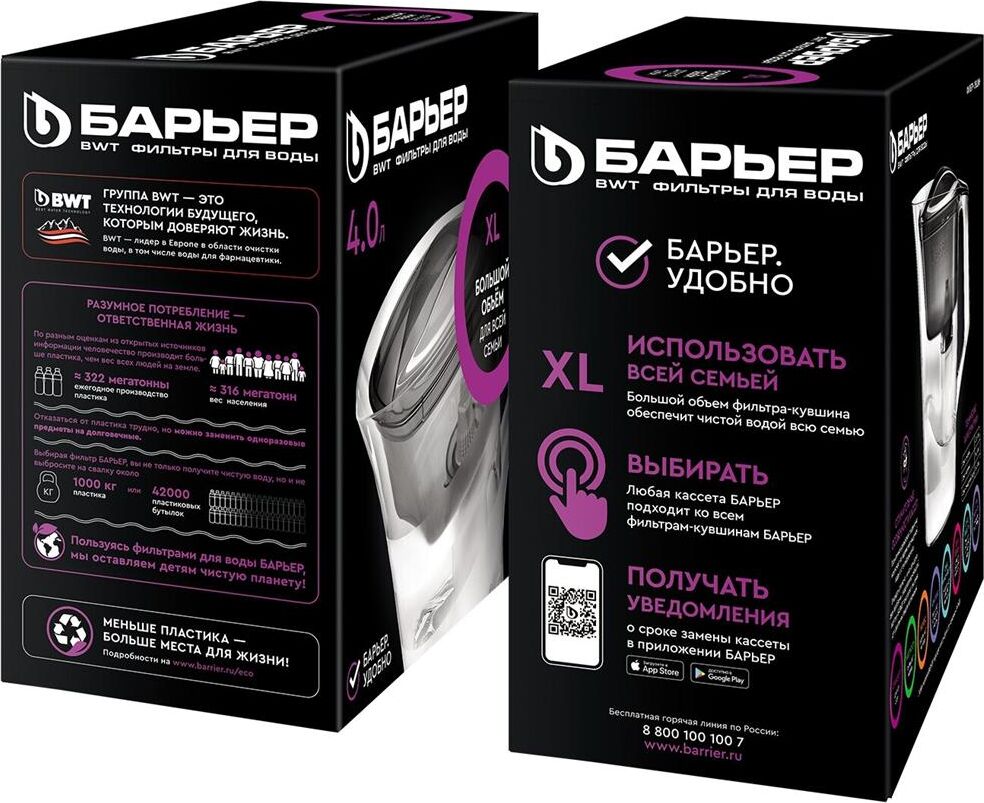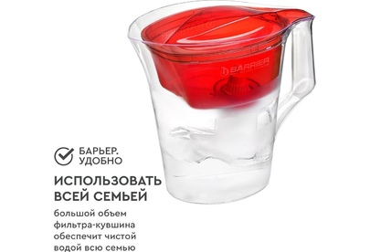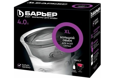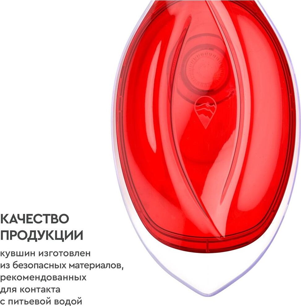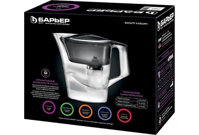 Эксклюзивный дизайн кушина разработан студией Артемия Лебедева, кувшин для большой семьи, объем кувшина 4 литра, объем воронки 1,4 литра, удобная цельнолитая ручка, широкий эргономичный выступ на крышке, срок службы не более 5 лет, кассета в комплекте, ресурс кассеты 350 л.