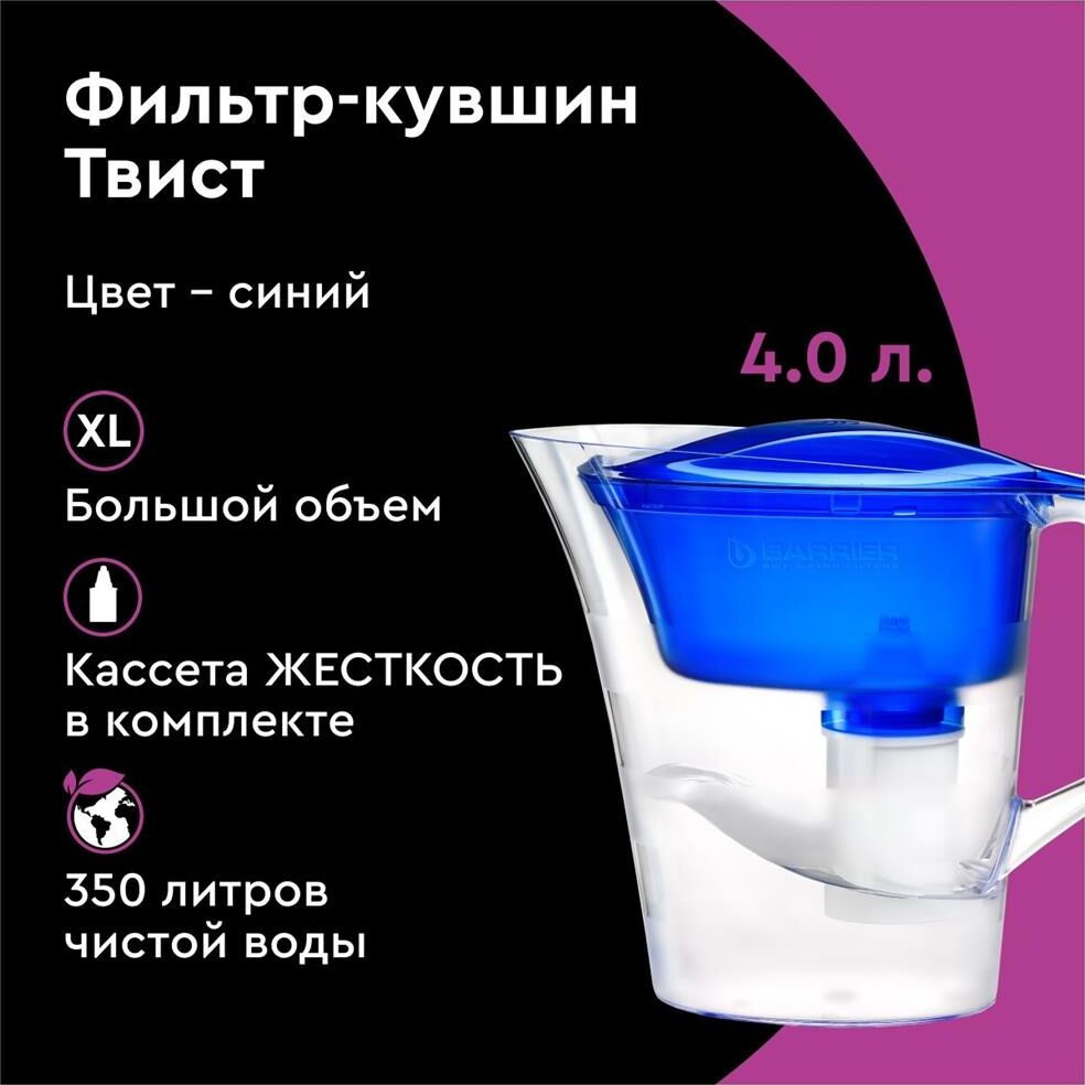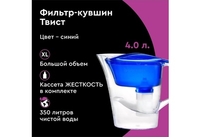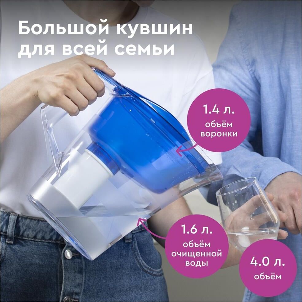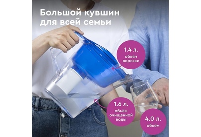 Эксклюзивный дизайн кушина разработан студией Артемия Лебедева, кувшин для большой семьи, объем кувшина 4 литра, объем воронки 1,4 литра, удобная цельнолитая ручка, широкий эргономичный выступ на крышке, срок службы не более 5 лет, кассета в комплекте, ресурс кассеты 350 л.