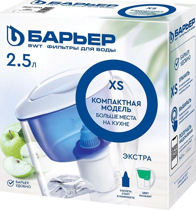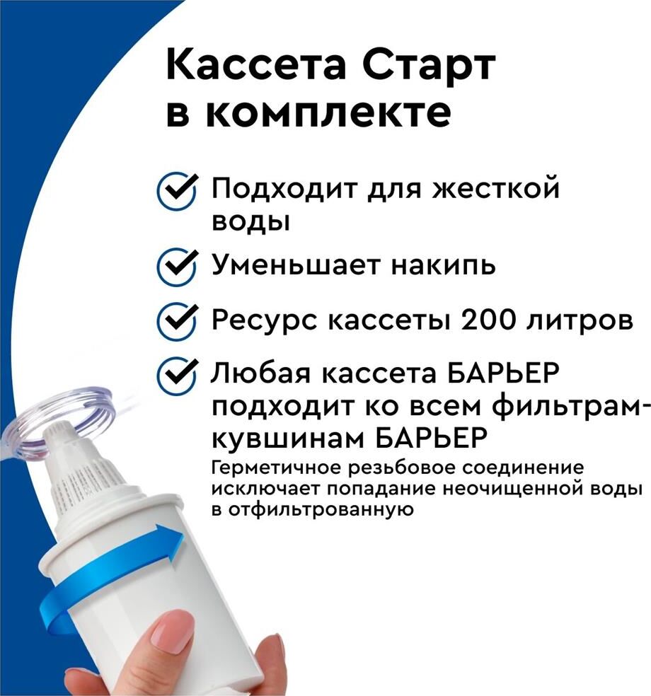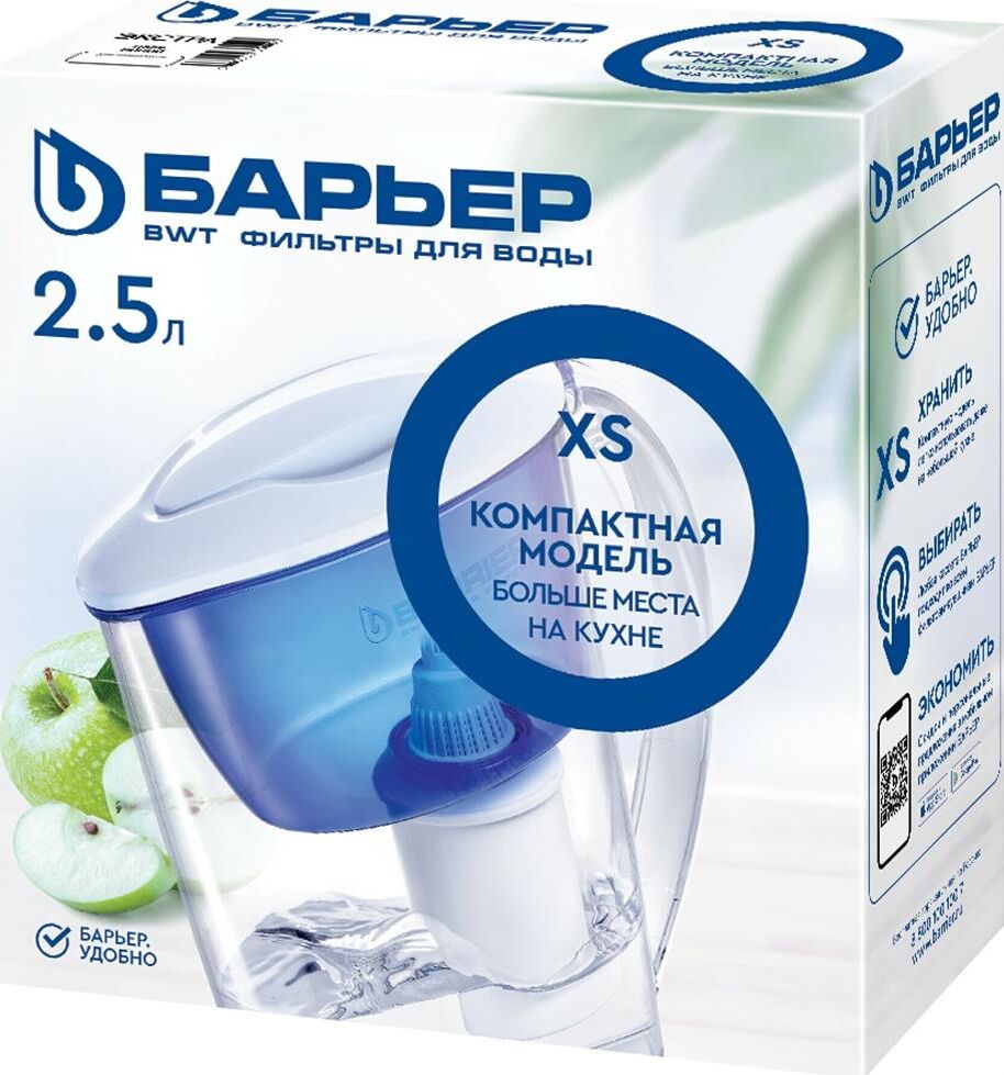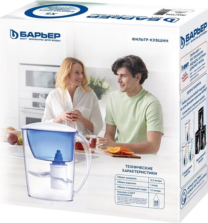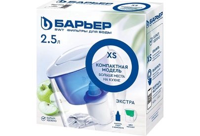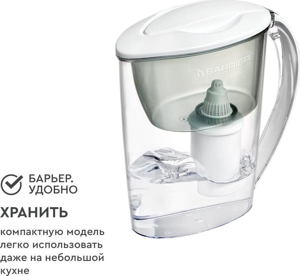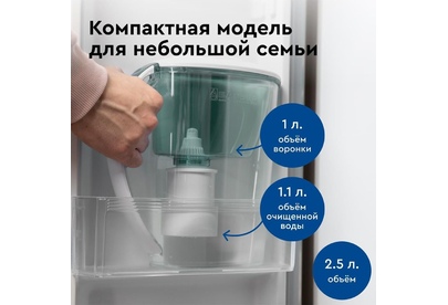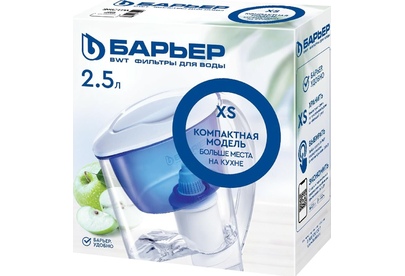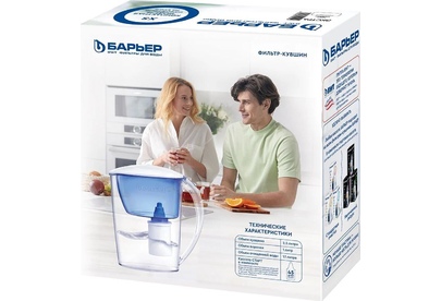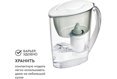 Узкий кувшин небольшого объема. За счет компактных размеров помещается в дверце холодильника. Конструкция крышки защищает воду от попадания пыли. Воронка автоматически откидывается при наклоне кувшина. Надежное резьбовое крепление не позволяет попасть неочищенной воде в отфильтрованную. В комплекте с кувшином кассета БАРЬЕР Старт с ресурсом 200 литров. Кассета умягчает воду, защитит от хлора, тяжелых металлов и других вредных примесей. Кувшин можно мыть в посудомоечной машине. Одна кассета БАРЬЕР способна заменить несколько сотен пластиковых бутылок. По окончании ресурса кассету можно сдать на переработку. Объем емкости 2.5 л В комплекте накопительная емкость Физические параметры Производительность 0.3 л/мин Ресурс фильтрующего модуля 350 л Размеры ШхГхВ: 17х20х25 см Дополнительно Дополнительная информация объем отфильтрованной воды: 1.1 л; объем воронки: 1 л