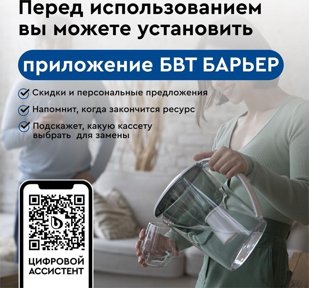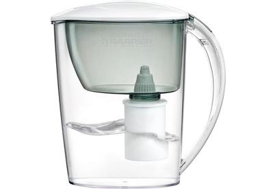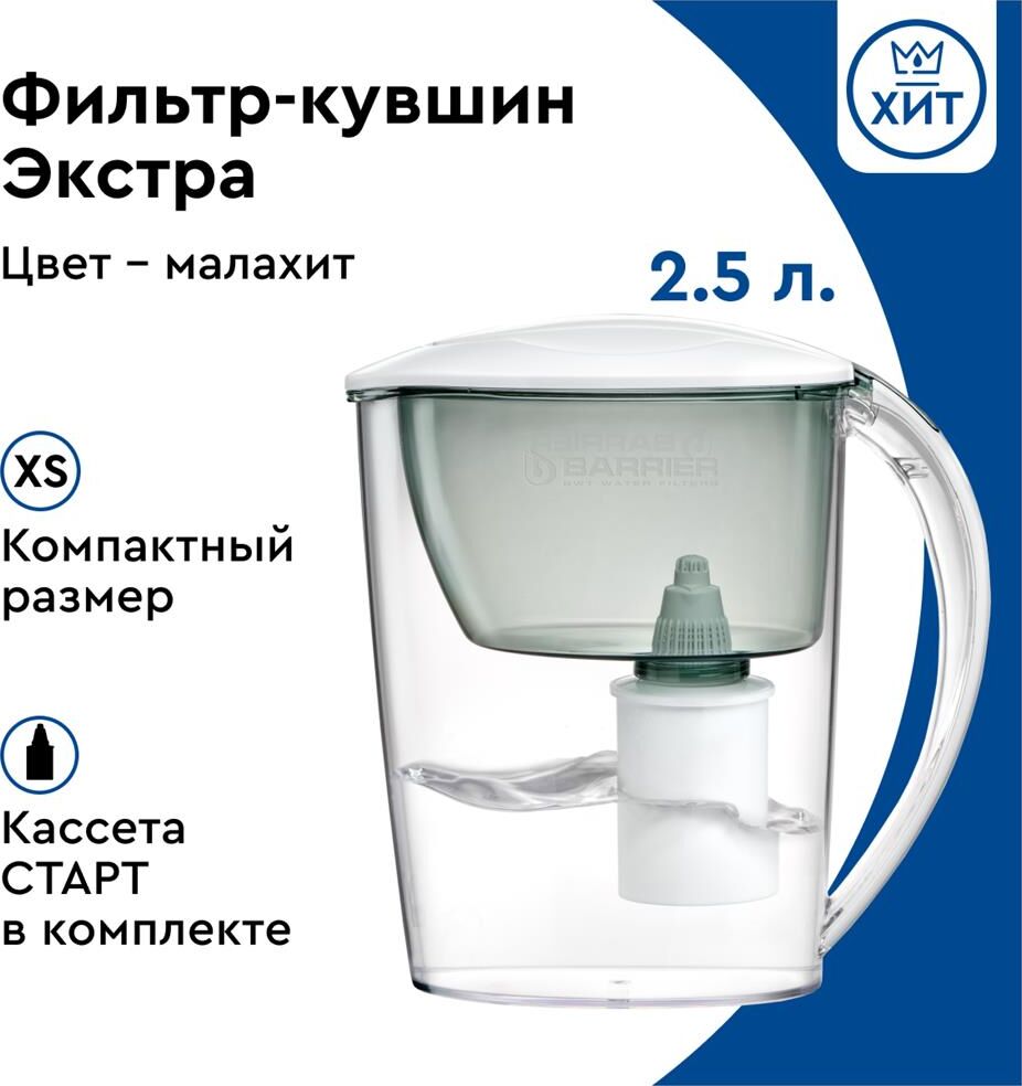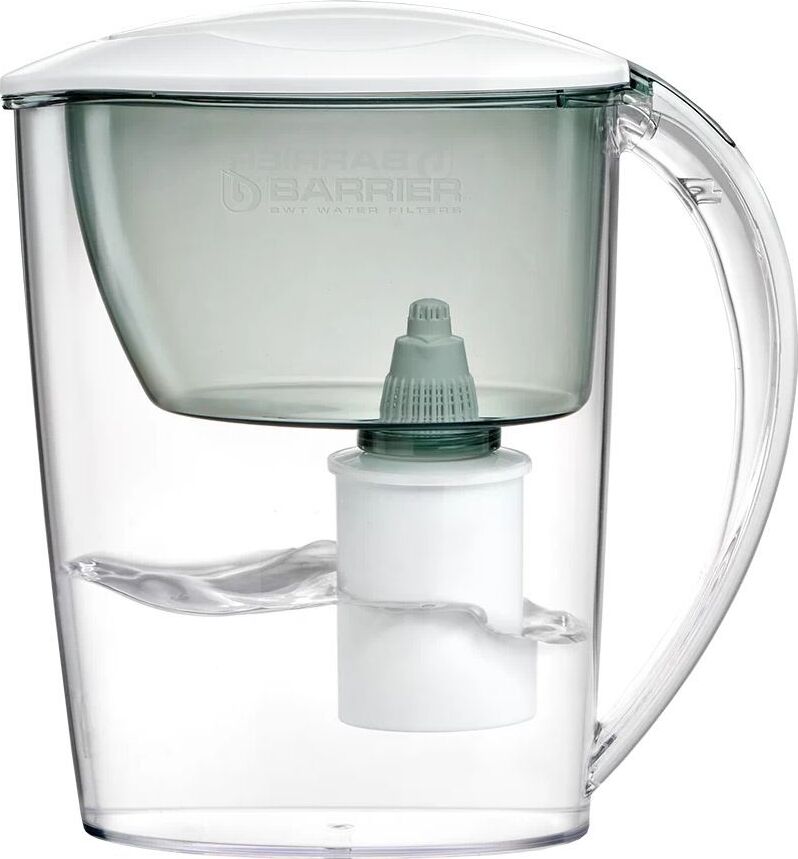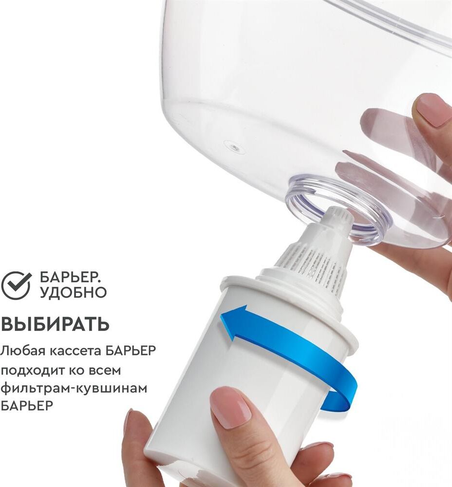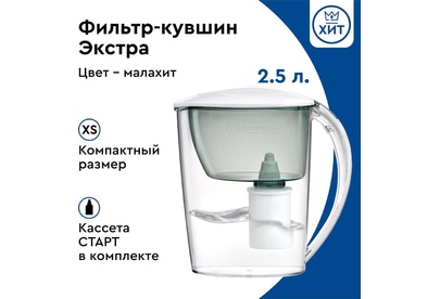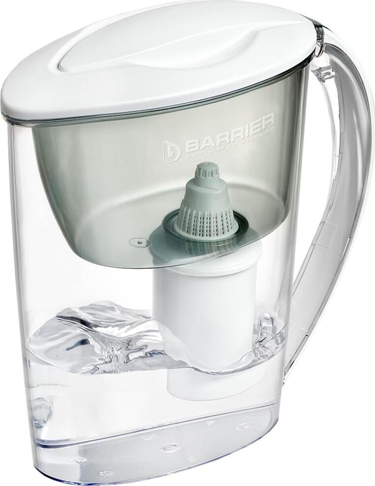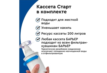 Узкий кувшин небольшого объема. За счет компактных размеров помещается в дверце холодильника. Конструкция крышки защищает воду от попадания пыли. Воронка автоматически откидывается при наклоне кувшина. Надежное резьбовое крепление не позволяет попасть неочищенной воде в отфильтрованную. В комплекте с кувшином кассета БАРЬЕР Старт с ресурсом 200 литров. Кассета умягчает воду, защитит от хлора, тяжелых металлов и других вредных примесей. Кувшин можно мыть в посудомоечной машине. Одна кассета БАРЬЕР способна заменить несколько сотен пластиковых бутылок. По окончании ресурса кассету можно сдать на переработку. Объем емкости 2.5 л В комплекте накопительная емкость Физические параметры Производительность 0.3 л/мин Ресурс фильтрующего модуля 350 л Размеры ШхГхВ: 17х20х25 см Дополнительно Дополнительная информация объем отфильтрованной воды: 1.1 л; объем воронки: 1 л