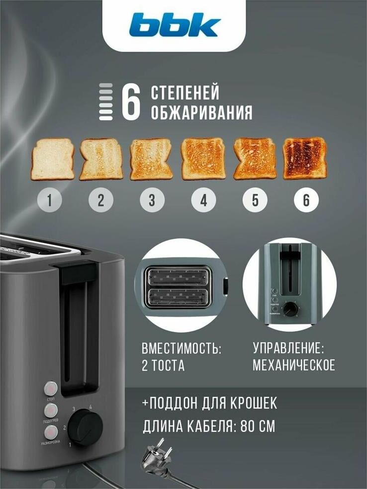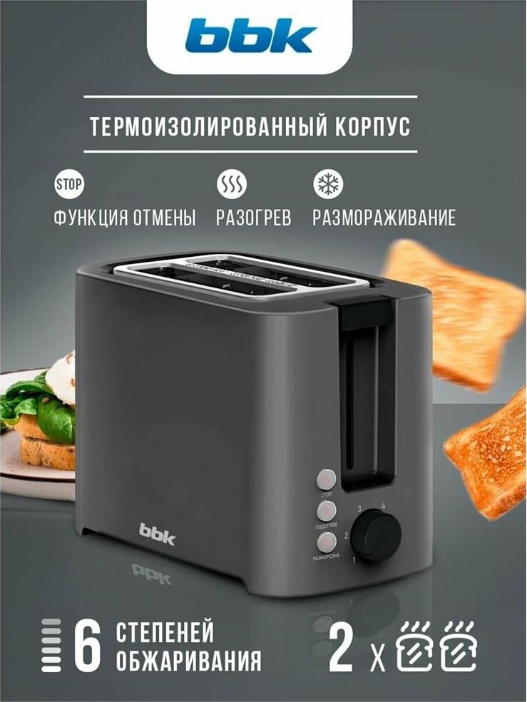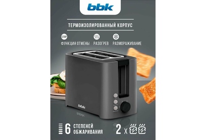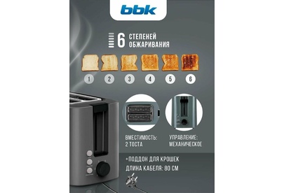 Мощность 800Вт; Отделения для двух тостов; 6 режимов приготовления; Клавиша отмены; Функция подогрева, Функция разморозки. Регулировка степени поджаривания; Термоизолированный корпус; Защита от перегрева; Съемный поддон для крошек