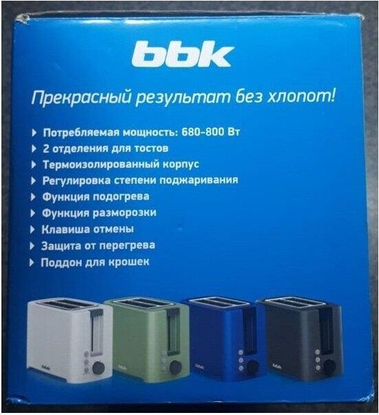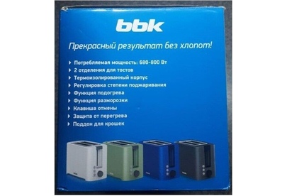 Мощность 800Вт; Отделения для двух тостов; 6 режимов приготовления; Клавиша отмены; Функция подогрева, Функция разморозки. Регулировка степени поджаривания; Термоизолированный корпус; Защита от перегрева; Съемный поддон для крошек