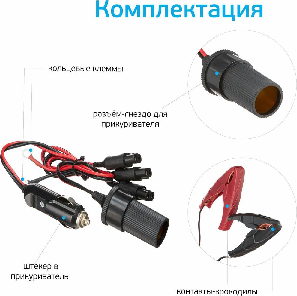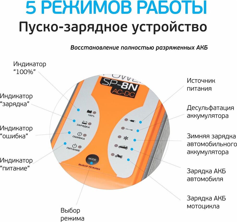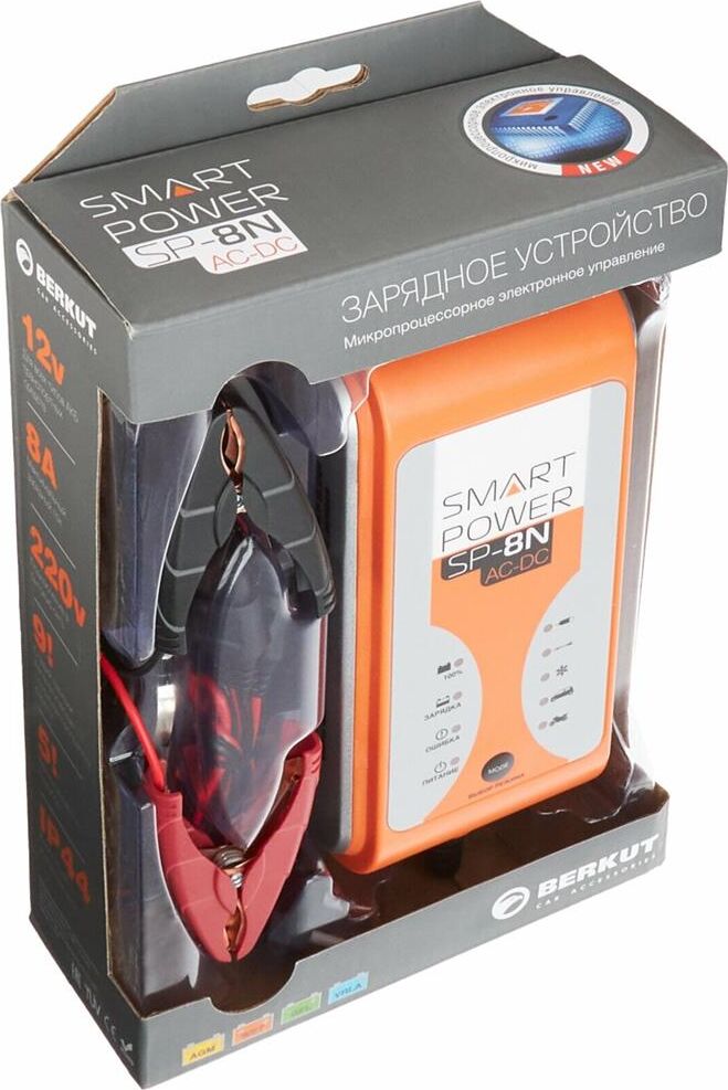 12 Вольт для аккумуляторных батарей транспортных средств 9 Стадий зарядкипоэтапная программа работы 8Aмаксимальный зарядный ток 220 Вольт подключение в бытовую сеть 5 режимов работы включая Десульфатацию и Источник питания