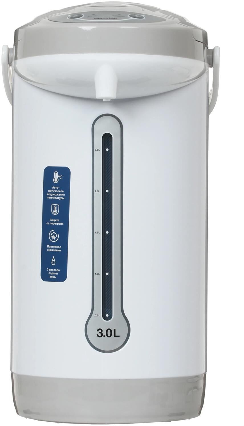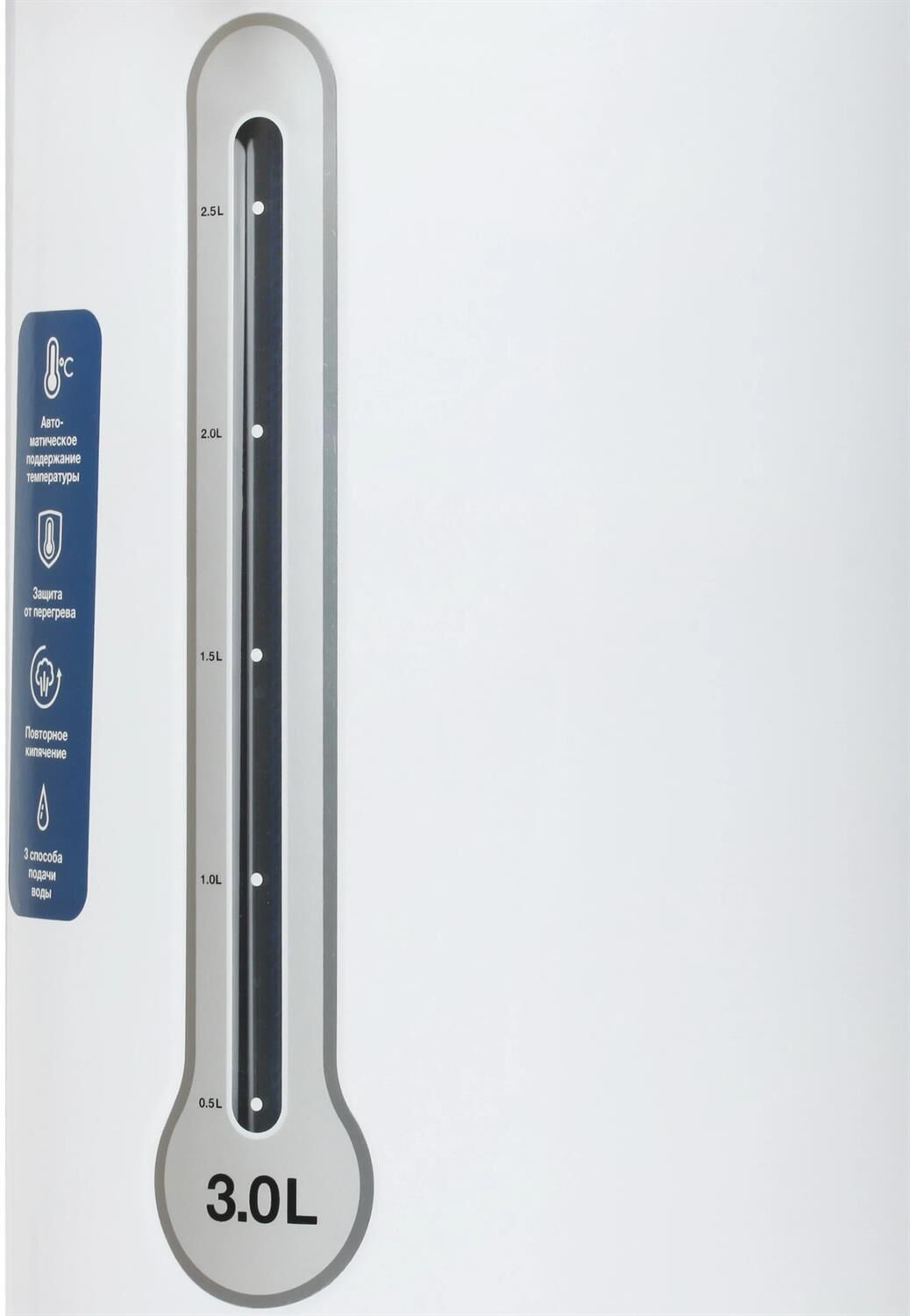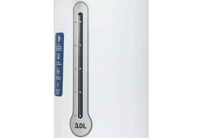 Общий объем 3л, Автоматическое поддержание температуры, Повторное кипячение, 3 способа подачи воды, Защита от включения без воды, Защита от перегрева, Блокировка крышки, Материал внутренней камеры Нержавеющая сталь, Мощность в режиме поддержания температуры 30 Вт, Потребляемая мощность 600 Вт, Напряжение 220-240В, 50/60Гц