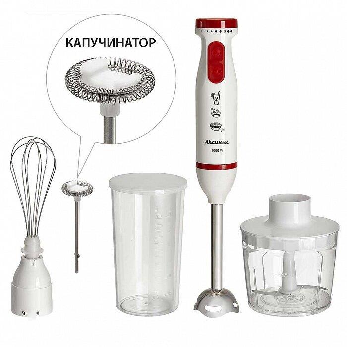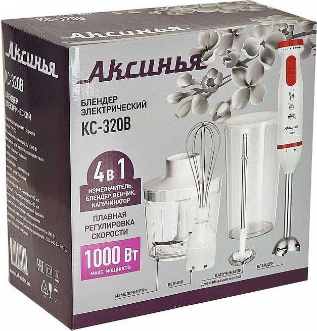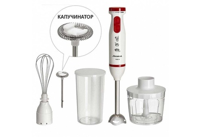 Параметры Максимальная мощность 1000 Вт Номинальная потребляемая мощность 600 Вт Объем чаши измельчителя 500 мл Объем мерного стакана 700 мл Описание Блендер электрический предназначен для смешивания, измельчения и взбивания продуктов и жидкостей в бытовых и аналогичных условиях Цвет: белый с красным Насадка и нож из нержавеющей стали Специальная заточка ножей Мерный стакан с крышкой Четыре сменные насадки: капучинатор из нержавеющей стали для приготовления молочной пенки, используемой для кофе измельчитель для измельчения орехов, трав, яиц, мяса, сыра, лука, рыбы, хлеба, чеснока, овощей и т.п. насадка для измельчения и смешивания для работы с мягкими и жидкими продуктами (приготовление соусов, супов, майонеза, детского питания, пюре, всех видов коктейлей и т.п.) венчик для взбивания яичных белков, сливок, смешивания жидких продуктов, замешивания жидкого теста Плавная регулировка скорости Режим «ТУРБО» Упаковка: цветная коробка