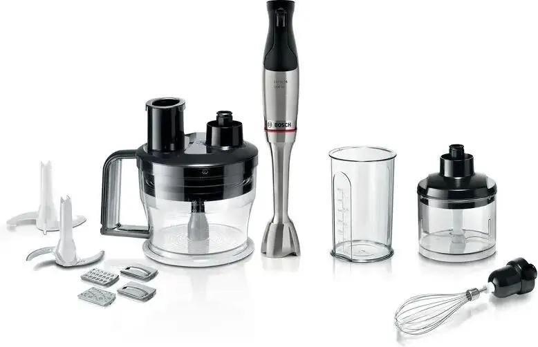 Блендер погружной, мощность 1200 Вт, материал корпуса: металл, материал погружной части: нержавеющая сталь, импульсный режим, защита от перегрева, в комплекте: венчик; измельчитель; крюк для замешивания теста; насадка-шинковка