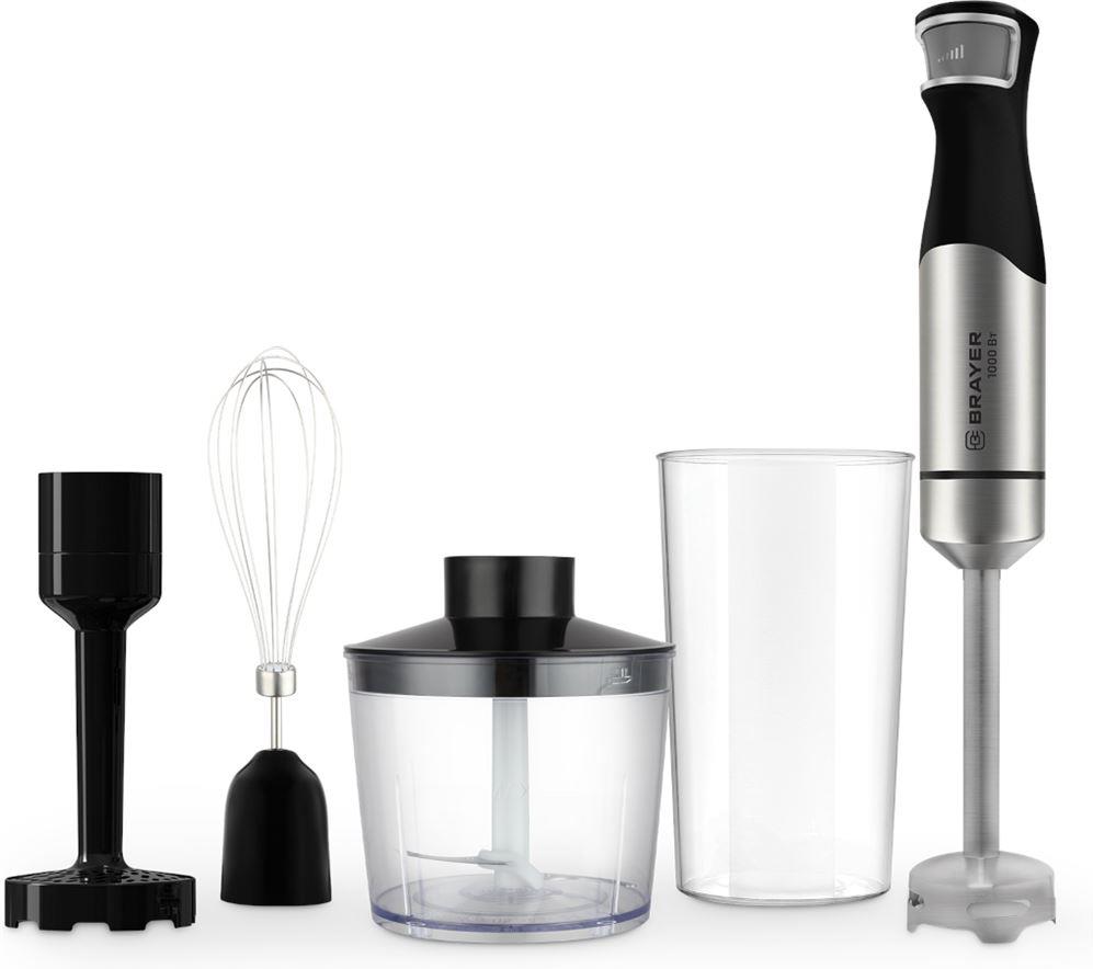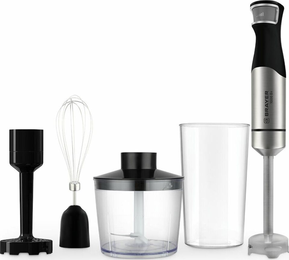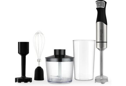 Максимальная мощность 1000 Вт Погружная часть и лезвия из нержавеющей стали Корпус из пластика, декорирован нержавеющей сталью Плавная регулировка скорости 5 скоростей Турборежим Скорость вращения: 15000 об/мин 20% Насадка венчик для взбивания Стакан для смешивания 700 мл Насадка блендер для измельчения и смешивания Насадка измельчитель объёмом 500 мл Насадка для приготовления пюре Длина шнура 1,2 м Электропитание 220 240 В, 50 60 Гц
