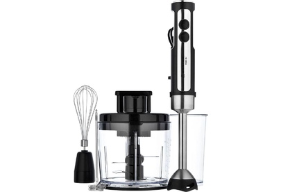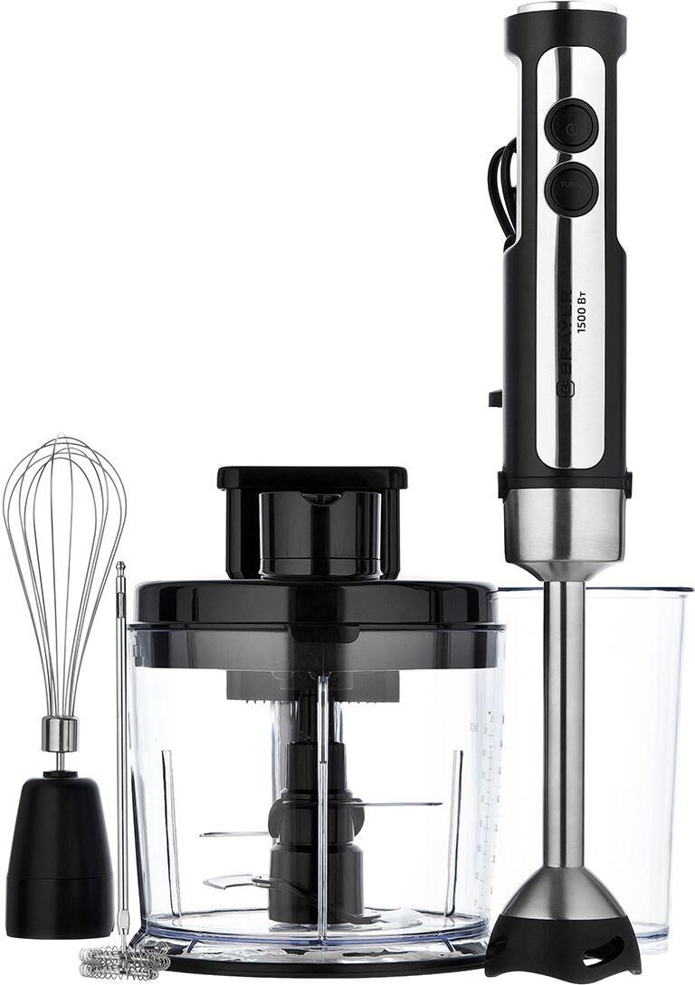 Мультифункциональный блендерный набор для измельчения, смешивания, шинковки и нарезки кубиками. Мощность 1500 Вт, Лезвия из титана. Погружная часть блендера с нейлоновым покрытием для предотвращения повреждения посуды. Корпус из пластика, декорирован нержавеющей сталью. Плавная регулировка скорости. Насадка-измельчитель объёмом 1,5 литра Диск для терки. Диск для шинковки. Насадка для нарезки продуктов кубиками S-образный нож из нержавеющей стали. Толкатель для чистки диска Насадка-венчик для взбивания. Стакан для смешивания 800 мл Насадка-блендер для измельчения и смешивания Капучинатор Электропитание 220-240 В, ~50-60 Гц