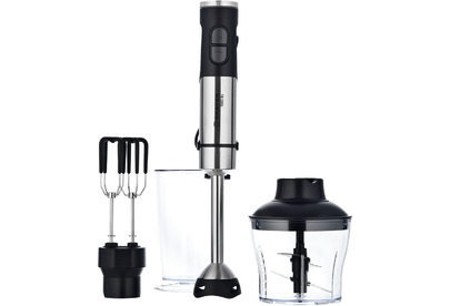 Мощность 1500 Вт Лезвия из титана Погружная часть блендера с нейлоновым покрытием для предотвращения повреждения посуды Корпус из пластика, декорирован нержавеющей сталью Плавная регулировка скорости Насадка-миксер для взбивания с нейлоновым покрытием для предотвращения повреждения посуды Стакан для смешивания 800 мл Насадка-блендер для измельчения и смешивания Насадка-измельчитель объемом 600 мл Электропитание 220-240 В, ~ 50-60 Гц