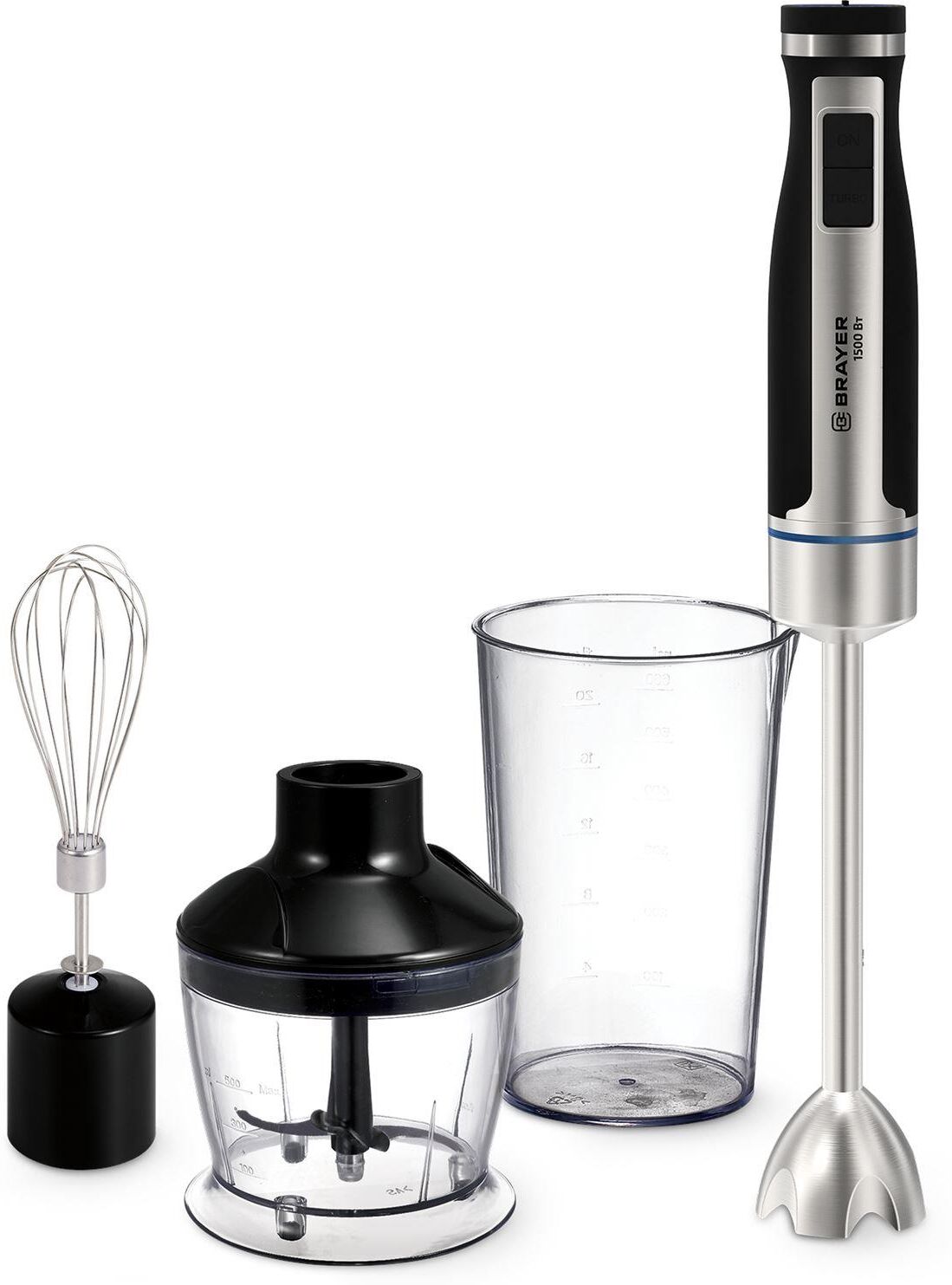 Мощность 1500 Вт Лезвия из титана Погружная часть из нержавеющей стали Корпус из пластика, декорирован нержавеющей сталью Плавная регулировка скорости Турборежим Скорость вращения: 14000 об/мин ± 10% Насадка-венчик для взбивания Стакан для смешивания 600 мл Удлиненная насадка-блендер для измельчения и смешивания Насадка-измельчитель объёмом 500 мл Длина шнура 1 м Электропитание 220-240 В, 50-60 Гц
