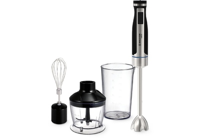 Мощность 1500 Вт Лезвия из титана Погружная часть из нержавеющей стали Корпус из пластика, декорирован нержавеющей сталью Плавная регулировка скорости Турборежим Скорость вращения: 14000 об/мин ± 10% Насадка-венчик для взбивания Стакан для смешивания 600 мл Удлиненная насадка-блендер для измельчения и смешивания Насадка-измельчитель объёмом 500 мл Длина шнура 1 м Электропитание 220-240 В, 50-60 Гц