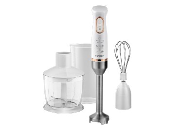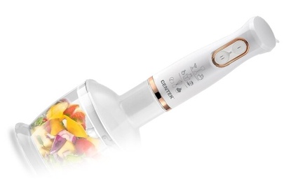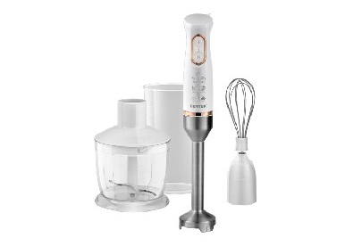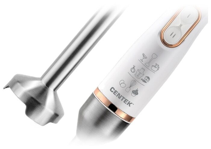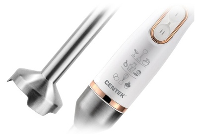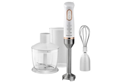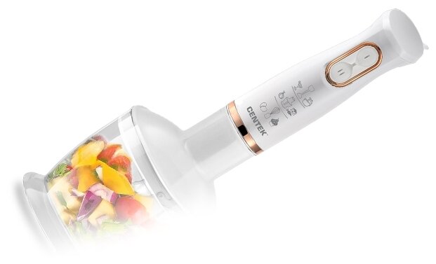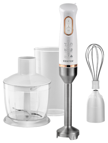 CENTEK CT-1347 WHITE Мощность800 Вт Мерный стакан600 мл Чоппер600 мл 2 режима работы Съемная насадка и венчик Лезвия из нержавеющей стали Специальная заточка лезвий DC мотор Комплект аксессуаров: Чоппер Миксерный венчик Блендерная насадка Мерный стакан