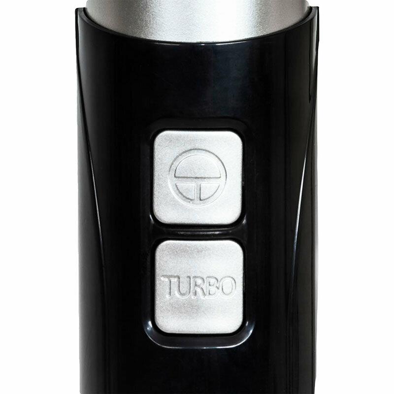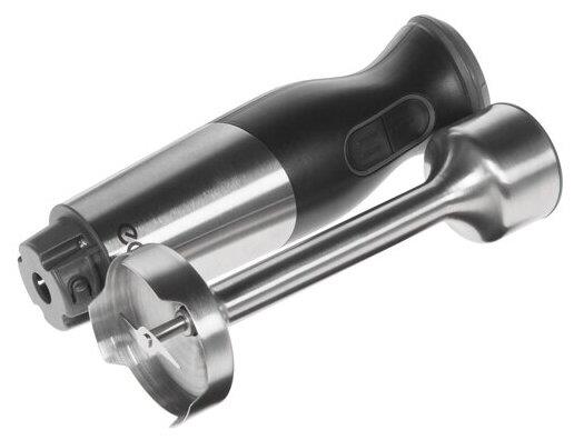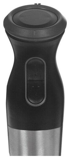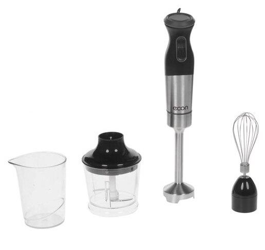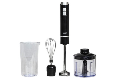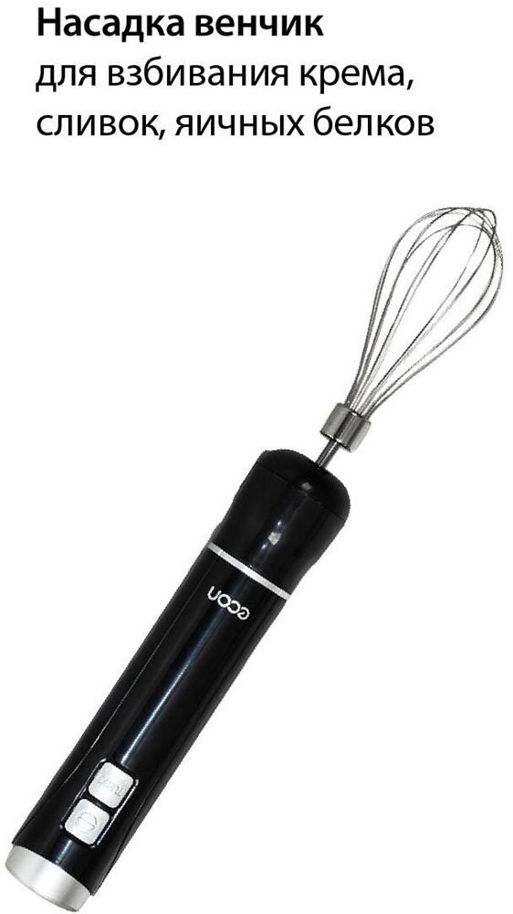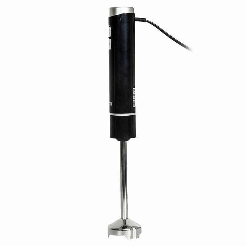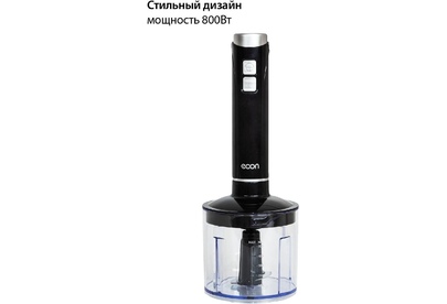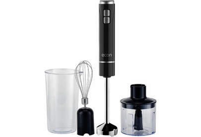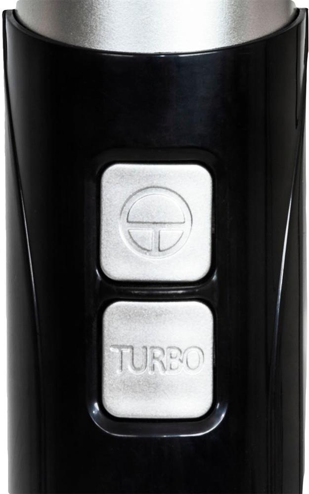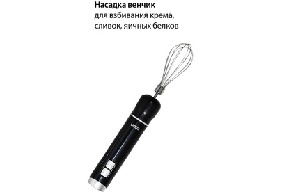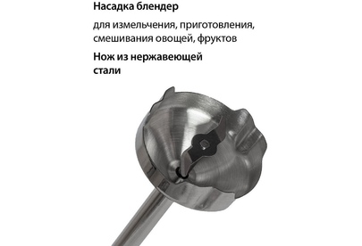 Блендер погружной, максимальная мощность 800 Вт, компактый размер - диаметр корпуса 42 мм, 2 скорости, насадка-блендер из нержавеющей стали, съемная насадка-венчик из нержавеющей стали, мини-измельчитель 500 мл, мерный стакан 700 мл, цвет черный с серым