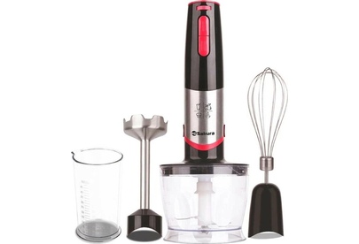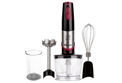 мощный и тихий DC мотор, 2 скорости работы — дополнительная регулировка, острые лезвия из нержавеющей стали, погружная часть блендера из нержавеющей стали, венчик из нержавеющей стали; 3 насадки (блендер, венчик, чоппер 0,5 л), стакан (0,5 л)
