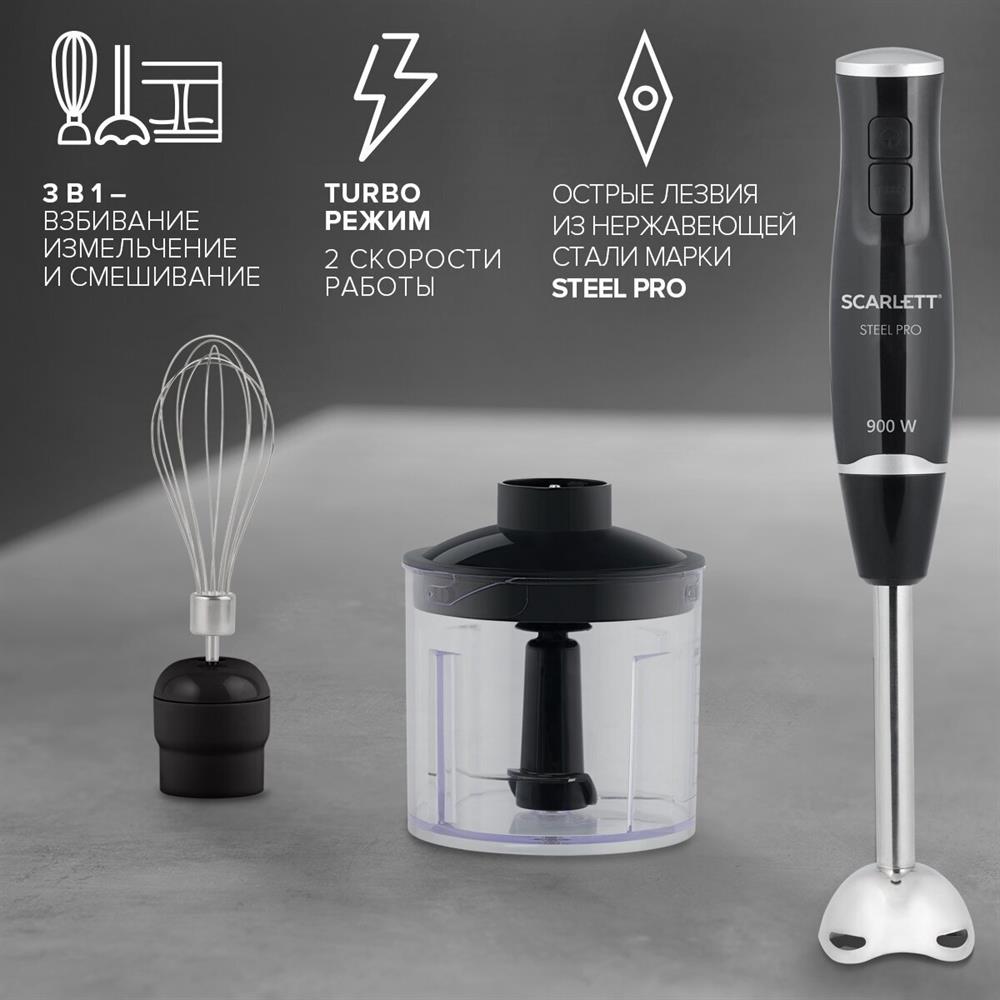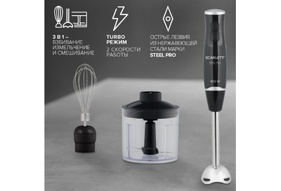 Тип: Погружной Мощность, Вт: 900 Количество скоростных режимов: 2 Режим TURBO: Да Защита от перегрузки: Да Емкость мини-измельчителя, л: 0.5 Насадка-блендер: Да Материал погружной части насадки-блендера: Нержавеющая сталь STEEL PRO Мойка в посудомоечной машине: Венчик (металлическая часть), мини-измельчитель без крышки Материал корпуса: Пластик Длина электрошнура, м: 1 Цвет: Черный. Scarlett SC-HB42F08 – современный погружной блендер 3в1 предназначен для измельчения, взбивания и смешивания продуктов. Погружная часть блендера изготовлена из нержавеющей стали марки Steel Pro, которая отлично подходит для приготовления блюд любой температуры. Блендер станет незаменимым помощником на кухне, ведь он имеет 2 скоростных режима, включая турбо режим, что позволит справиться с кулинарными задачами любой сложности. В комплект блендера включены: насадка для измельчения и смешивания, мини-измельчитель, объём которого составляет 500 мл, а также металлический венчик для взбивания.