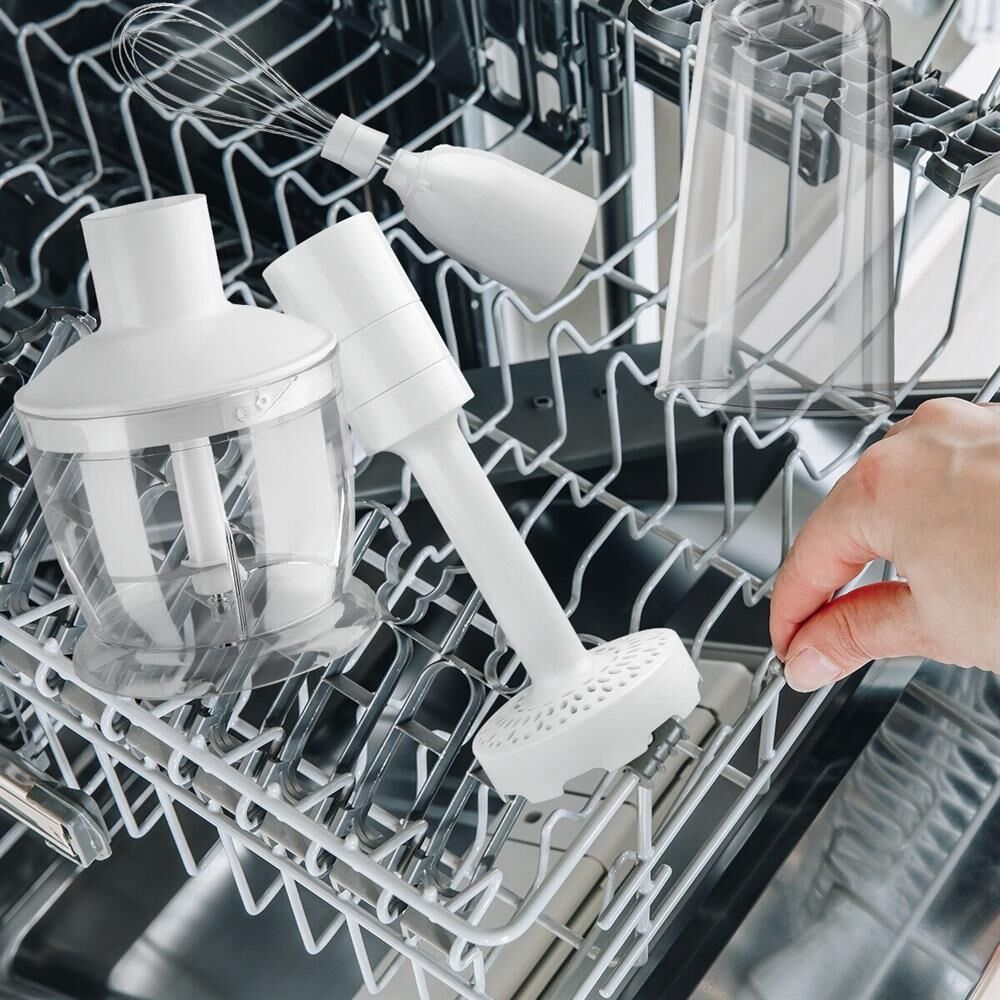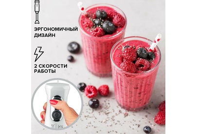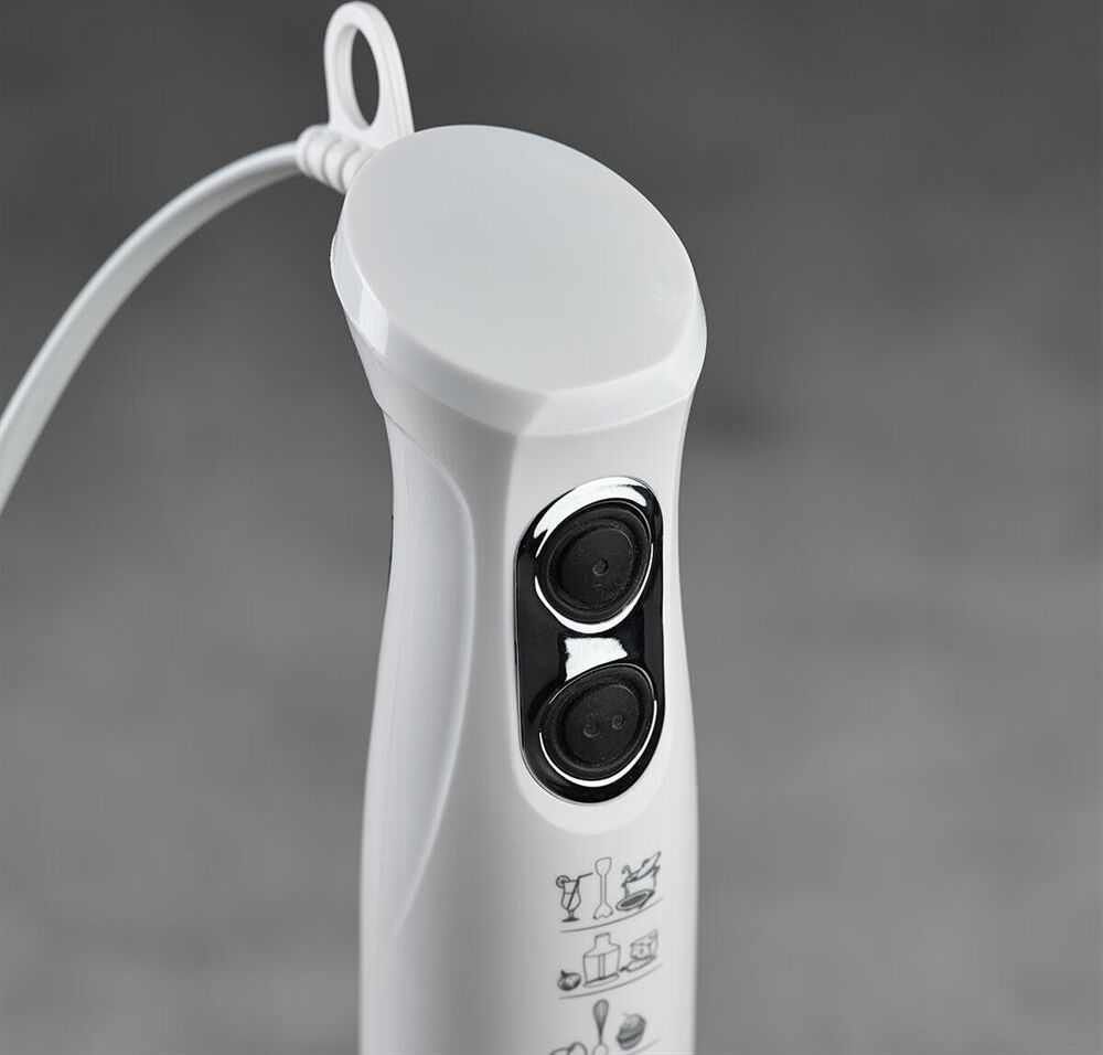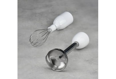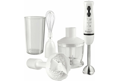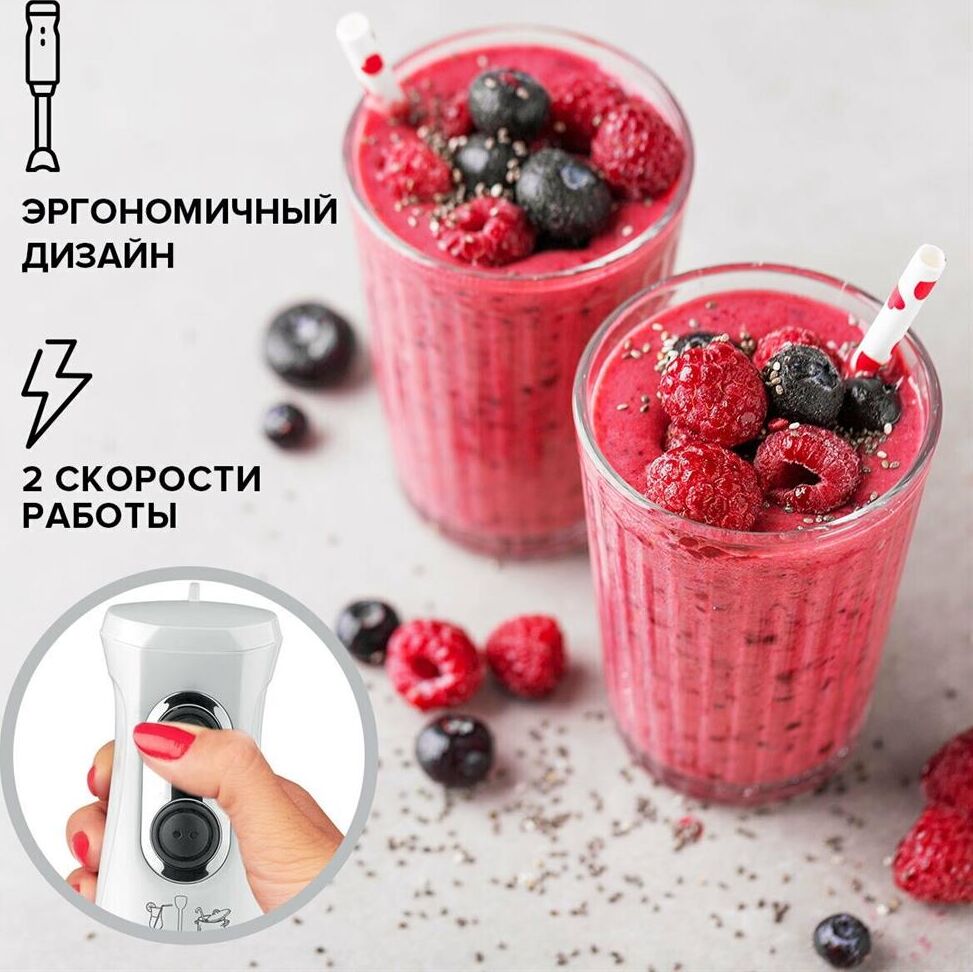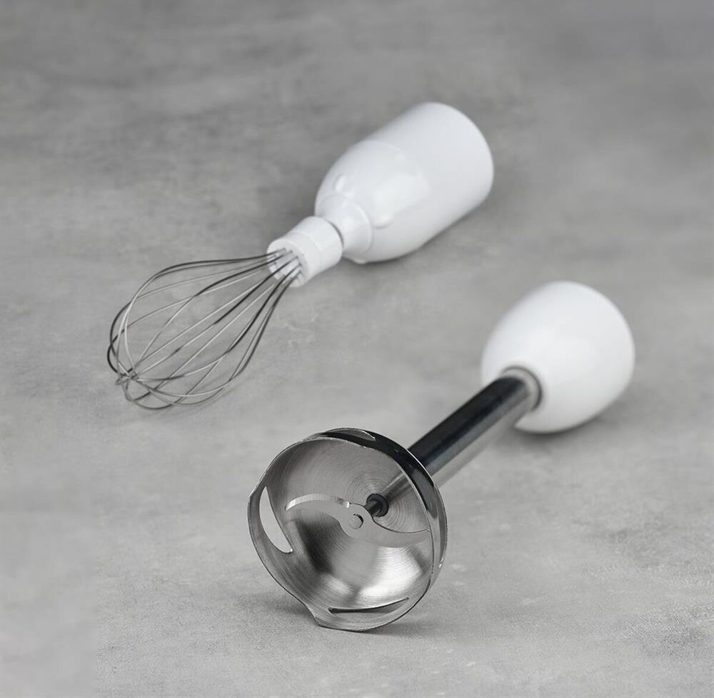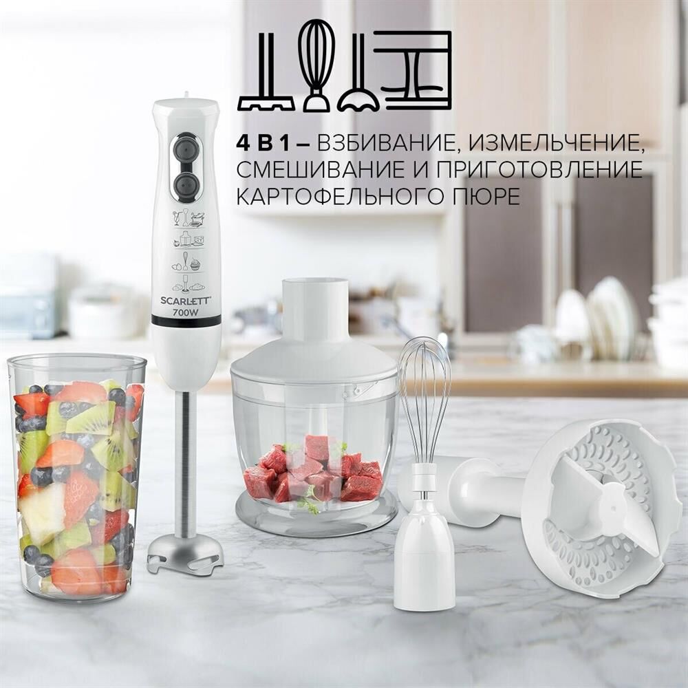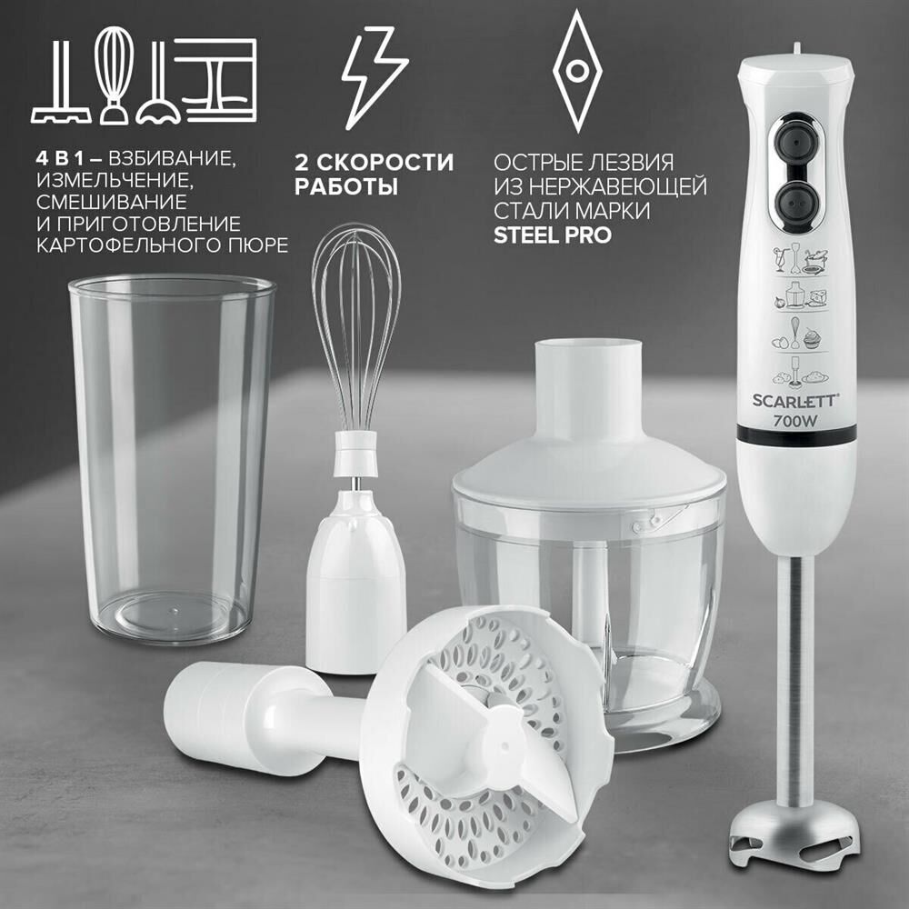 Максимальная мощность 700 Вт, 4 в 1: подходит для измельчения, взбивания, смешивания, приготовления картофельного пюре, Измельчитель 0.6л Насадка блендер из нержавеющей стали «Steel Pro», Венчик для взбивания Насадка для картофельного пюре - специальная насадка с двумя широкими лопастями приготовит идеальное воздушное пюре без комочков, Мерный стакан 0.6л
